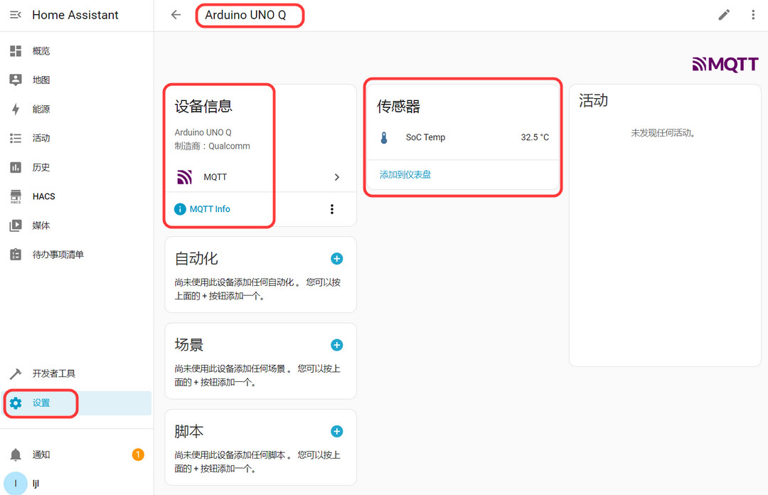 Arduino UNO Q 开发板结合 MQTT 与 Home Assistant 实现物联网 SoC 温度数据采集和远程监控。