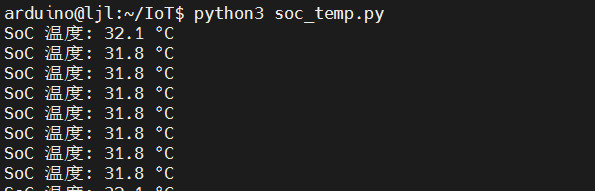 终端执行 python3 soc_temp.py 运行程序,终端打印实时温度数据