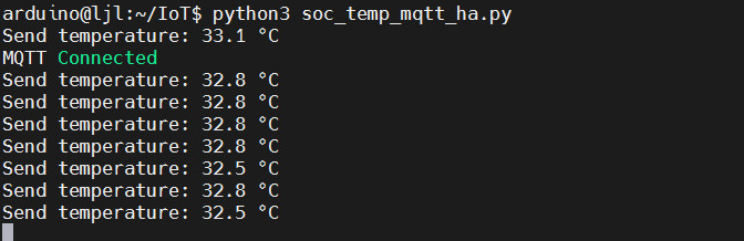 终端执行 python3 soc_temp_mqtt_ha.py 运行程序,终端打印发送的实时温度数据