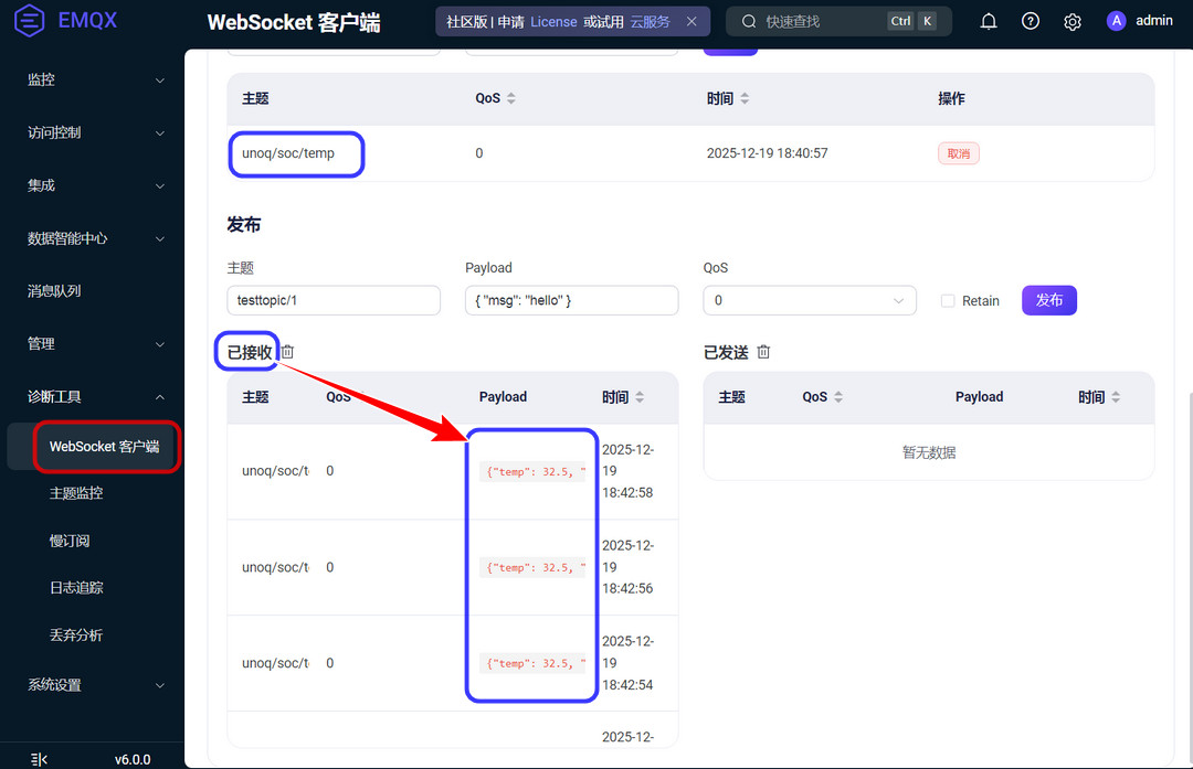 这里将 SoC 温度数据通过 MQTT 协议上传至云端 MQTT Broker 服务器 EMQX .