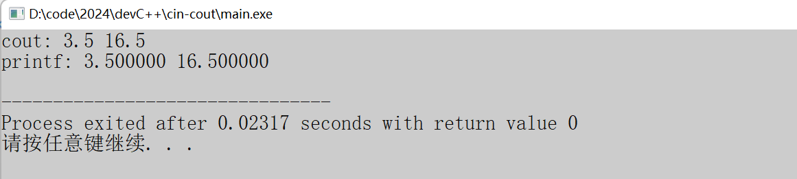 - cout默认不会输出六位小数,自动忽略小数后多余的0;printf函数打印浮点数时,会默认打印小数点后6位。
