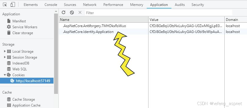 此 Cookie 名称为++.AspNetCore.Identity.Application 。我们可以在 Chrome 浏览器开发者工具的++ "应用程序"选项卡中查看此 Cookie 。请参见下图: