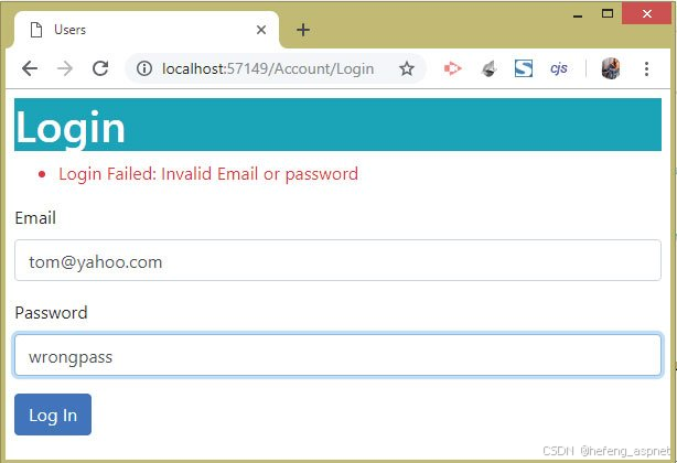 此操作方法有一个类型为Login.cs的参数,它通过该参数接收用户在Login.cshtml提供的登录表单中填写的登录值(即电子邮件和密码) 。该方法提供两个属性: