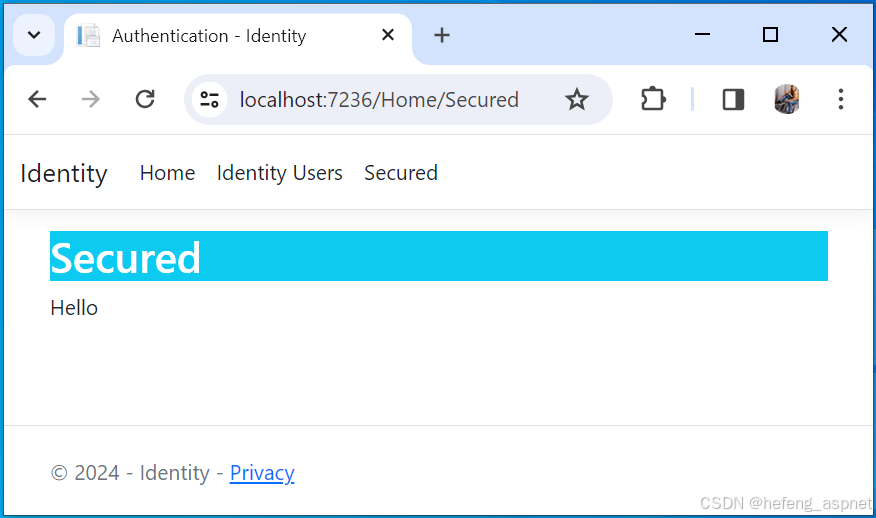 这里不需要身份验证,所以我们可以不受任何限制地调用安全操作方法。运行应用程序时,浏览器向主控制器的安全操作方法发送了一个++未经身份验证的请求++ (匿名请求)。这个未经身份验证的请求能够访问应用程序资源,也就是主控制器,因此我们在浏览器上看到了"Hello"消息。