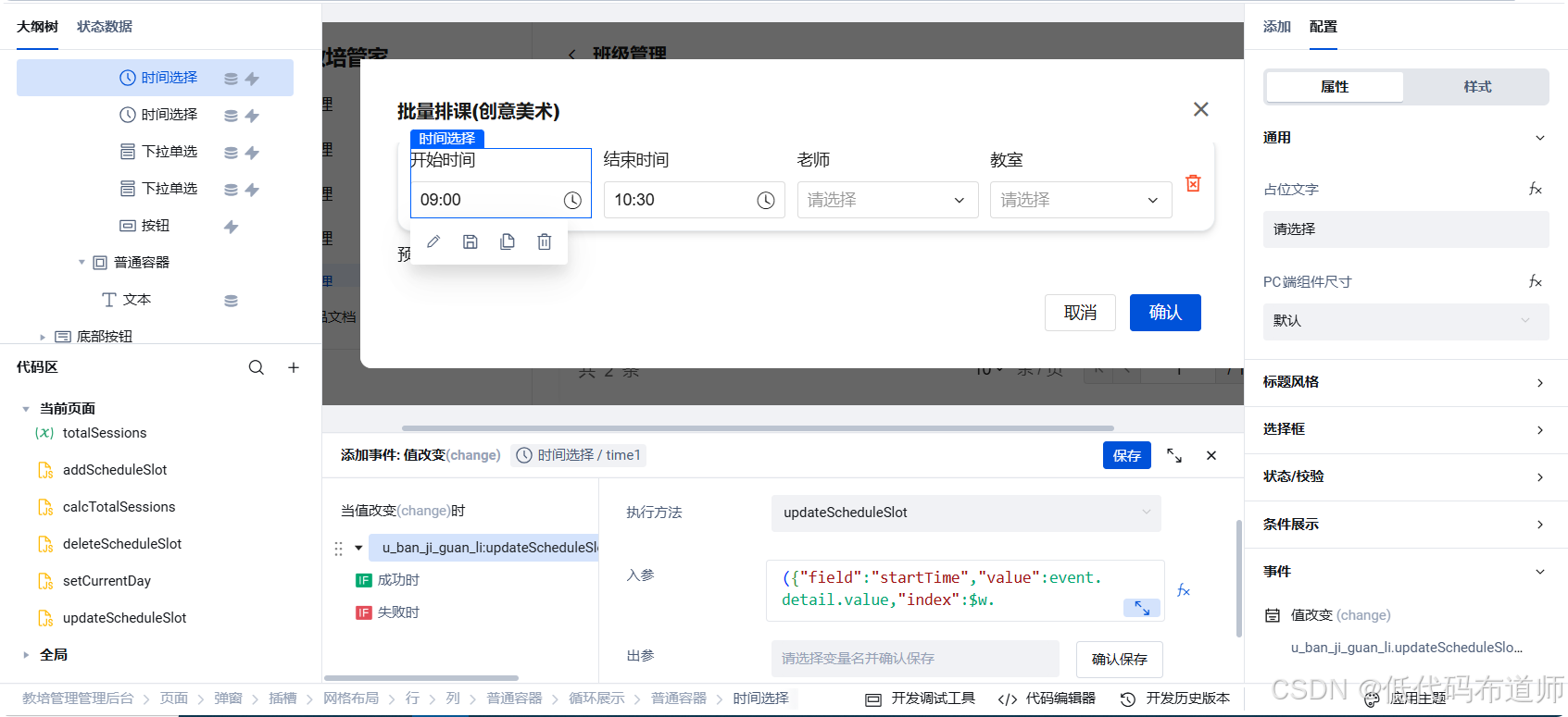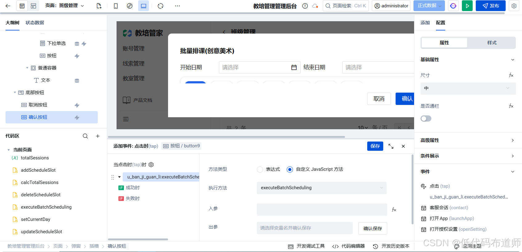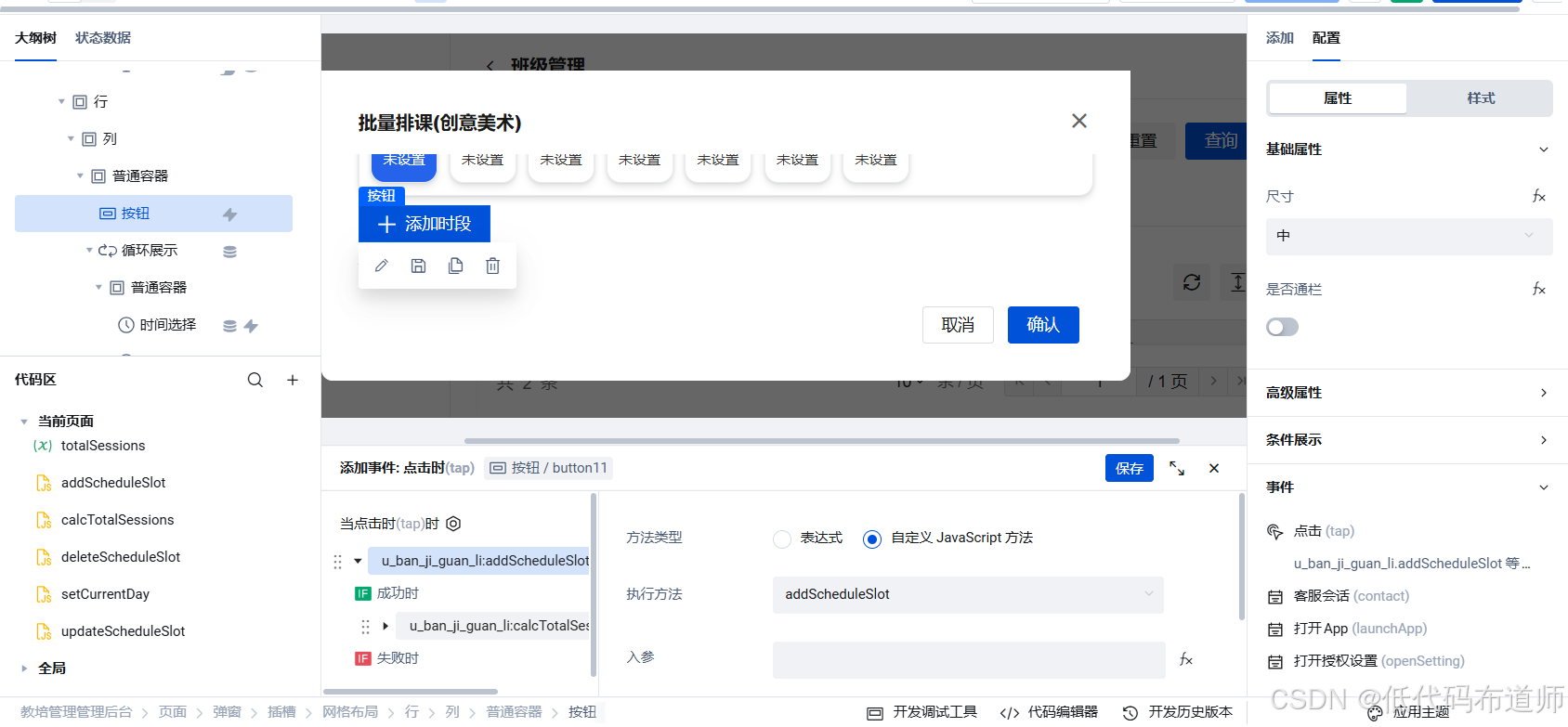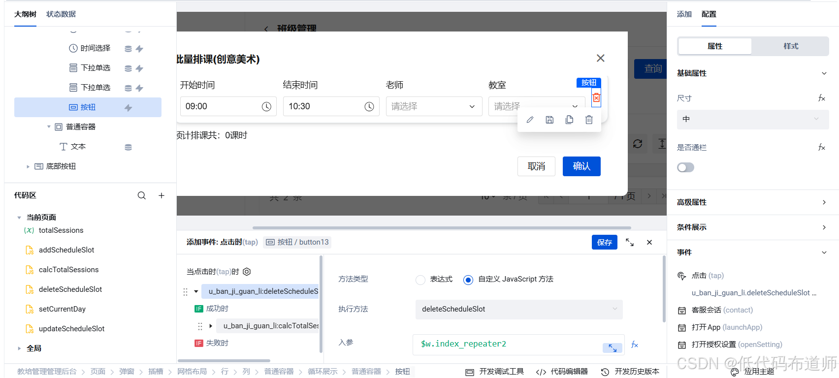 为了驱动复杂的排课交互,我们需要在"应用属性 -> 自定义方法"中编写以下核心逻辑。