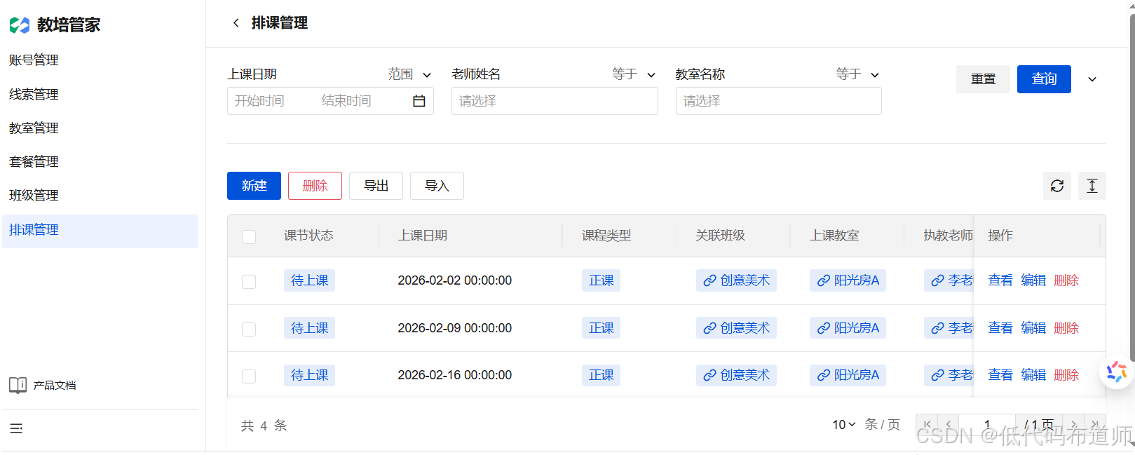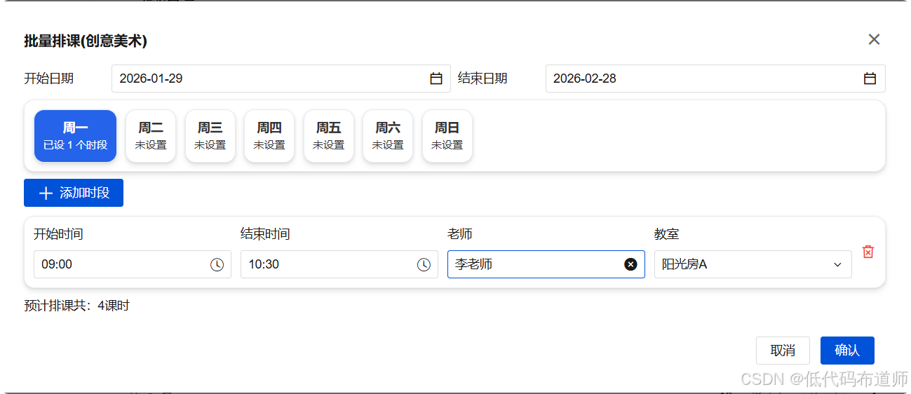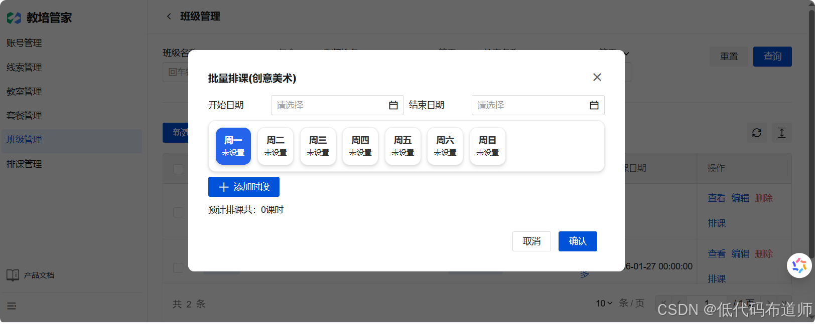通过这两篇的学习,我们实现了一个极具专业感的"智能排课向导"。这不仅是简单的增删改查,更是将**业务逻辑(排课规则)转化为生产数据(课节记录)**的典型案例。