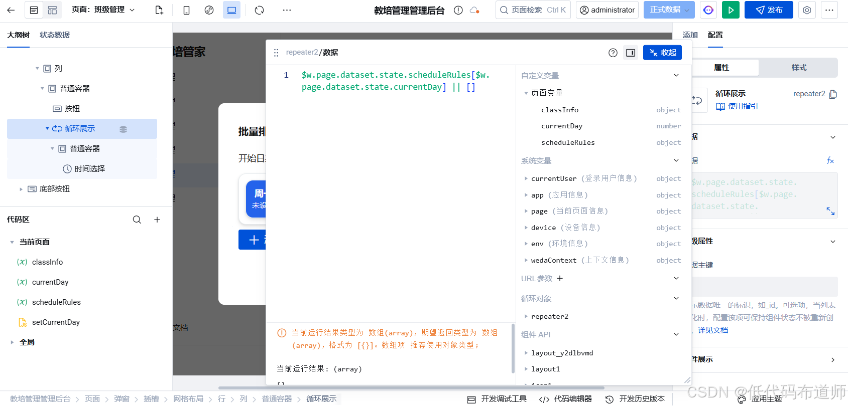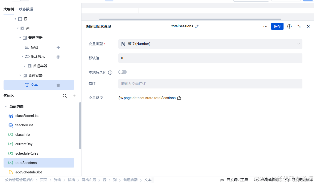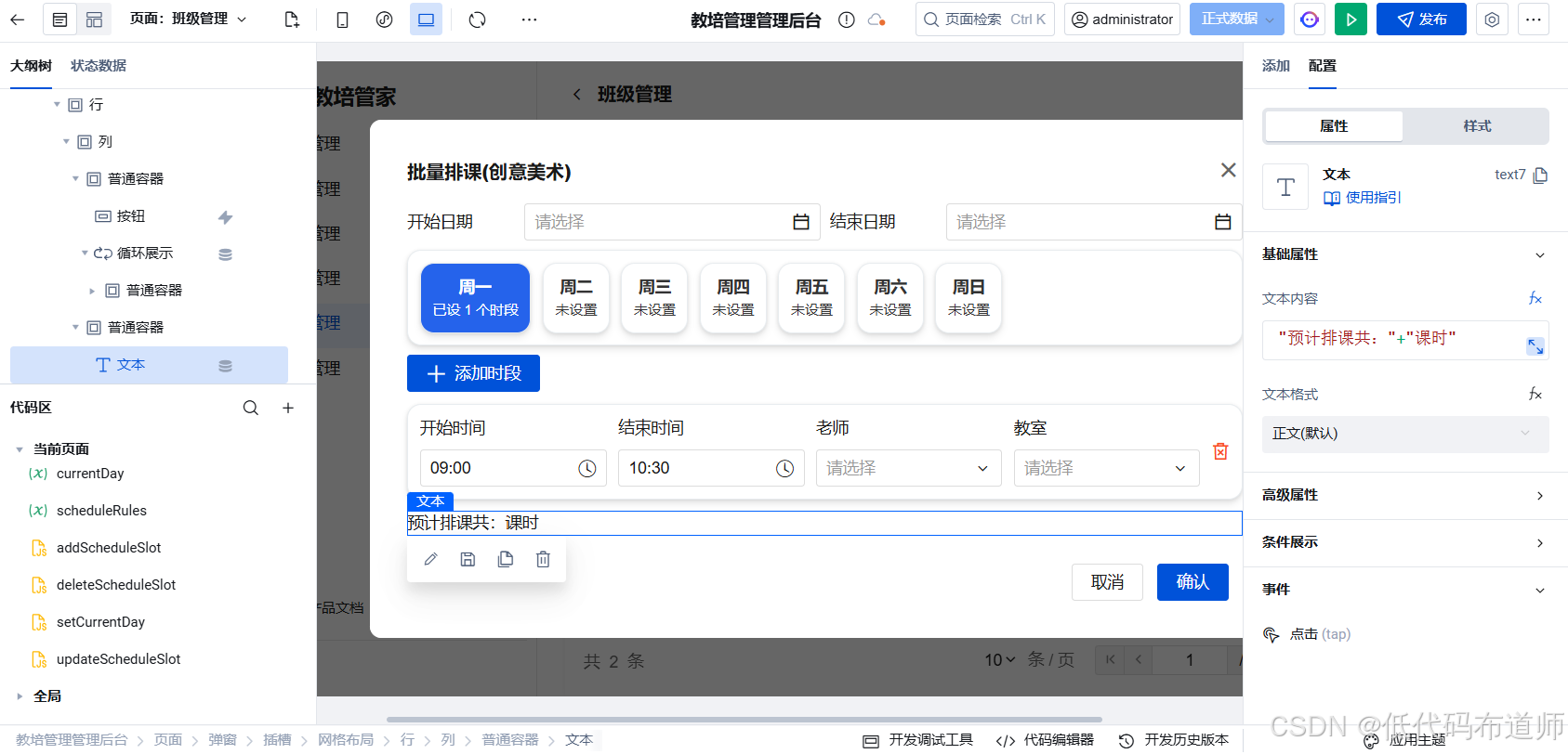 总课时预览 :添加文本组件,绑定公式计算整个周期内会生成的课节总数。