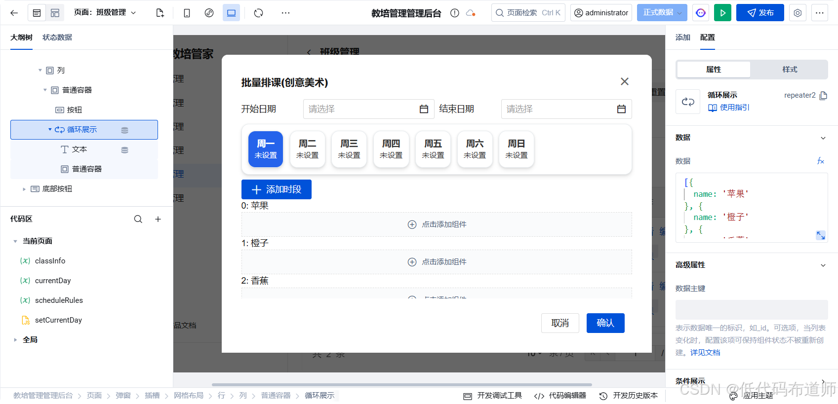在本讲的上半部分,我们完成了排课模型的建立、弹窗视图的初始化以及"周卡片"的切换交互。本篇我们将攻克最核心的两个环节:动态时段配置 与自动化排课算法。
