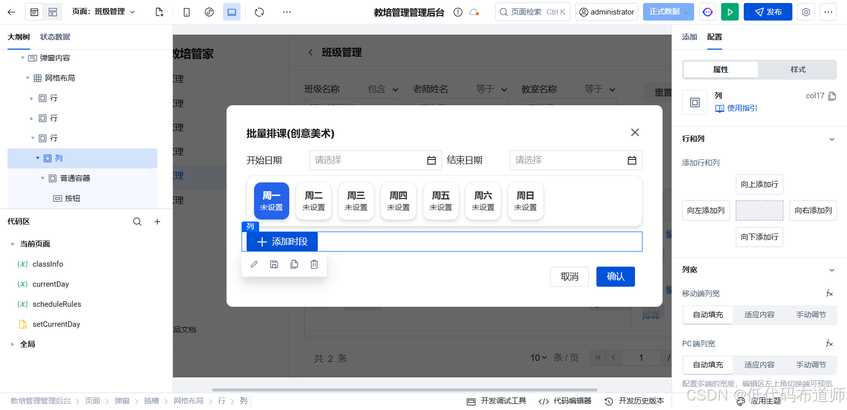 给弹窗的确认按钮添加点击事件,调用我们的批量排课方法