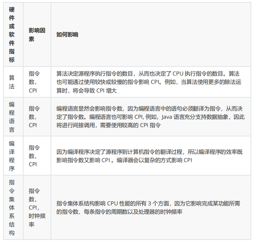上式表明,CPU的性能(CPU执行时间)取决于三个要素:主频、CPI 和指令条数。主频、CPI和指令条数是相互制约的。例如,更改指令集可以减少程序所含的指令条数,但同时可能引起CPU结构的调整,从而可能会增加时钟周期的宽度(降低主频)。