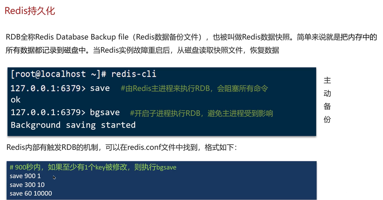 RDB全称Redis数据备份文件,也被叫做Redis数据快照,RDB通过快照的形式保存某一时刻的数据状态。当Redis实例故障重启后,从磁盘读取快照文件,恢复数据。