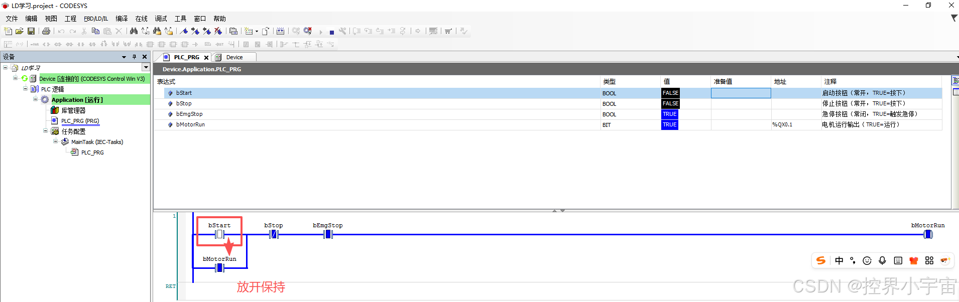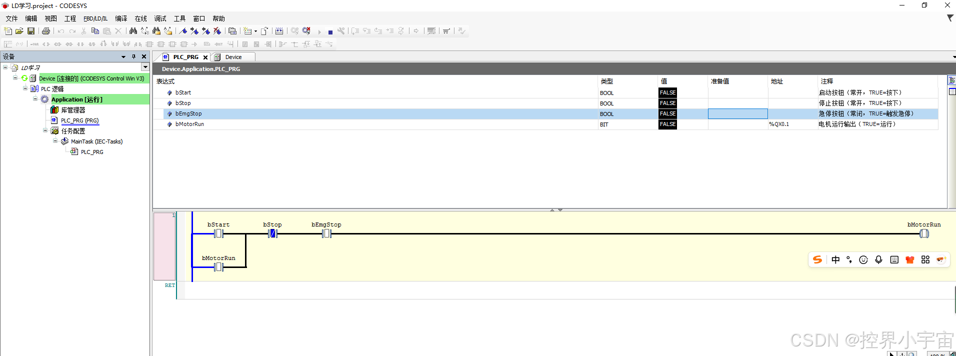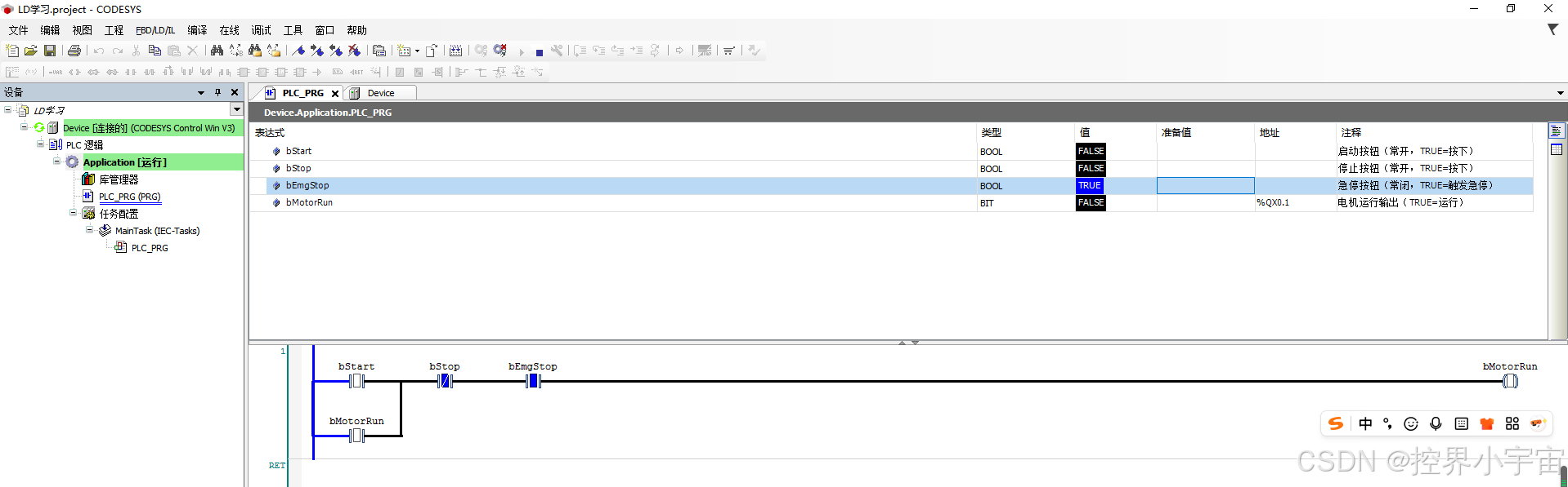 实现电机的手动启停控制:① 按下启动按钮(bStart),电机运行(bMotorRun)并自锁;② 按下停止按钮(bStop)或急停按钮(bEmgStop),电机停止;③ 急停优先级最高,触发后需复位急停才能再次启动。