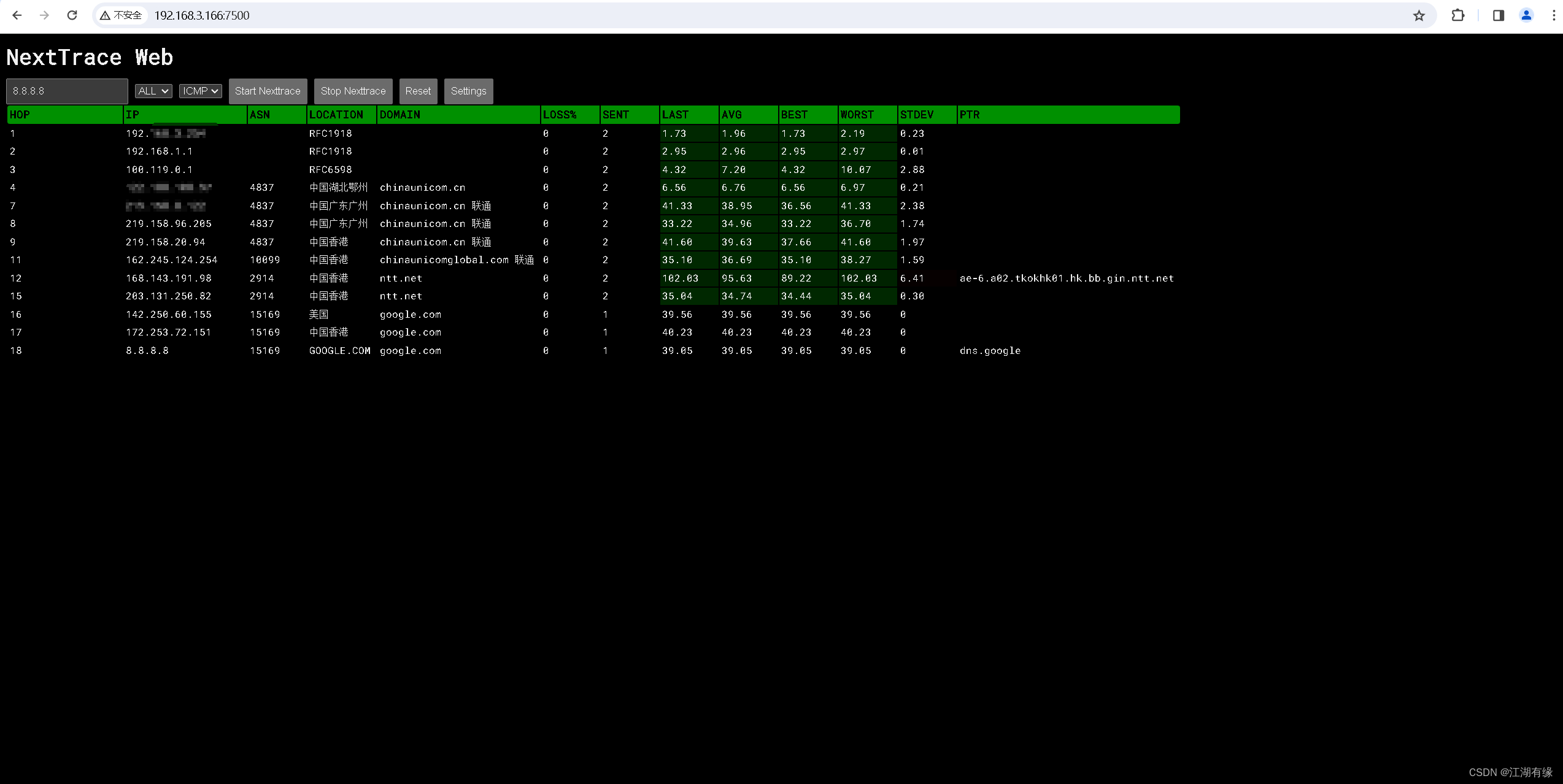 8.8.8.8,然后点击开始查询。可以看到本机访问8.8.8.8的路由路径了。