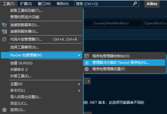 打开 Visual Studio → 点击工具 → NuGet 包管理器 → 程序包管理控制台。