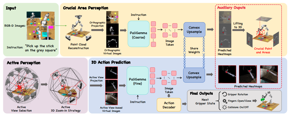 该研究设计了一个"由粗到精"的主动感知框架:首先通过多视角投影定位关键 3D 区域,然后利用主动视角选择(避开遮挡)和主动 3D 变焦(放大细节)来优化视觉输入,最后结合 VLM(视觉语言模型)预测精确的动作。