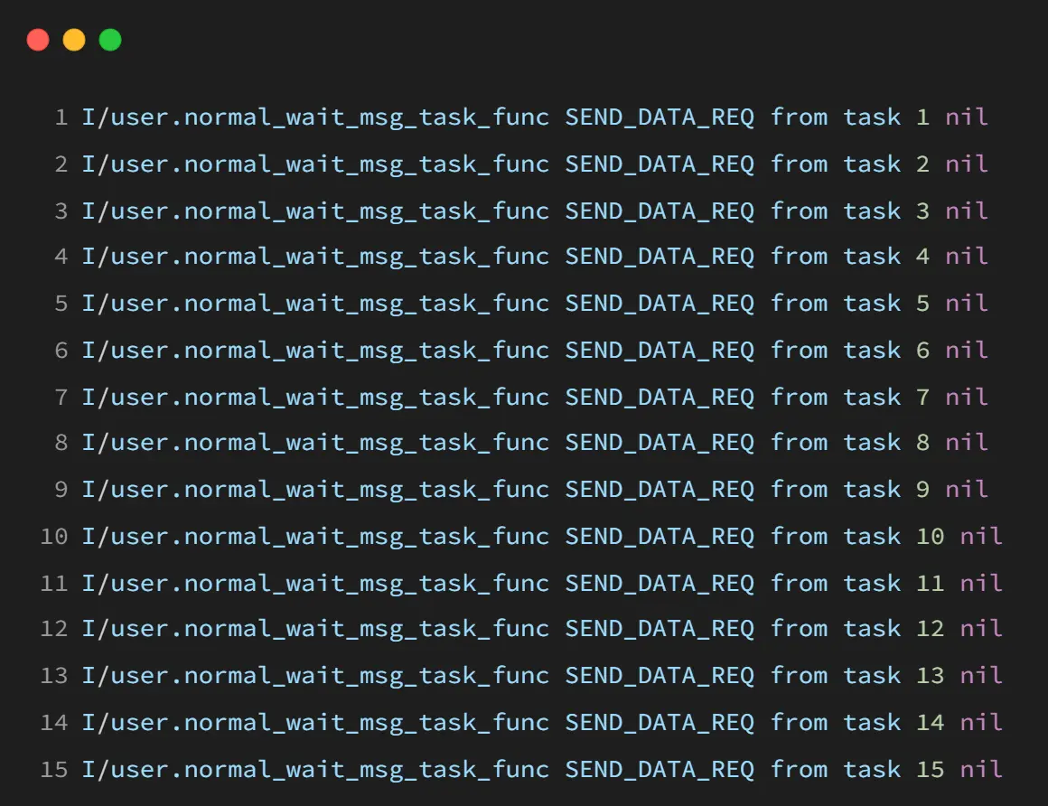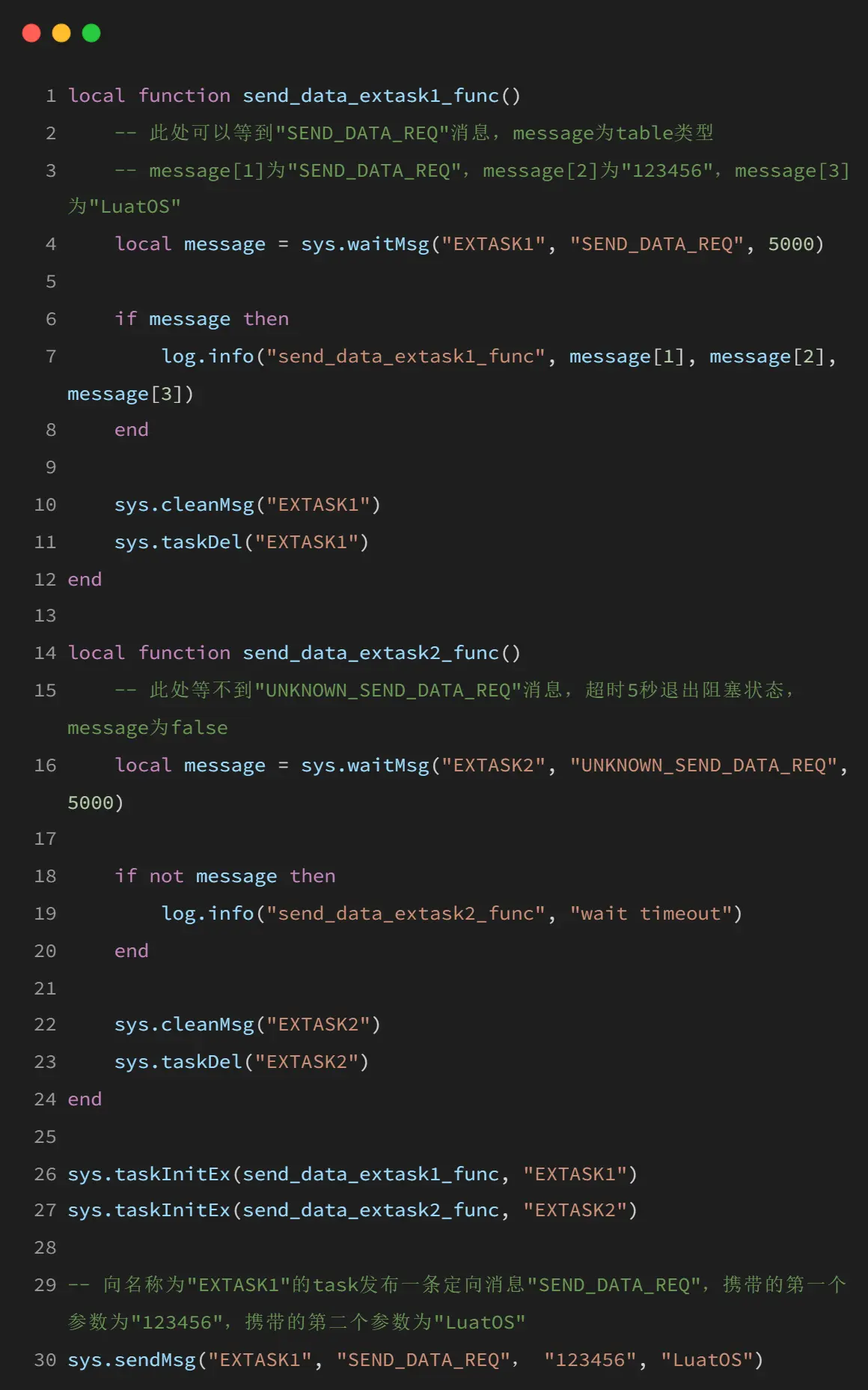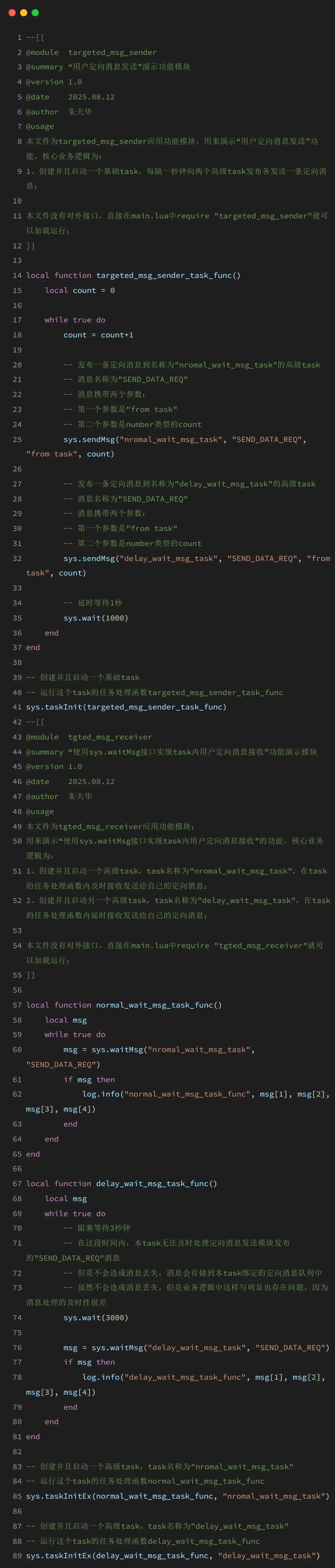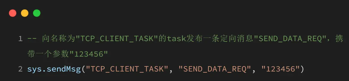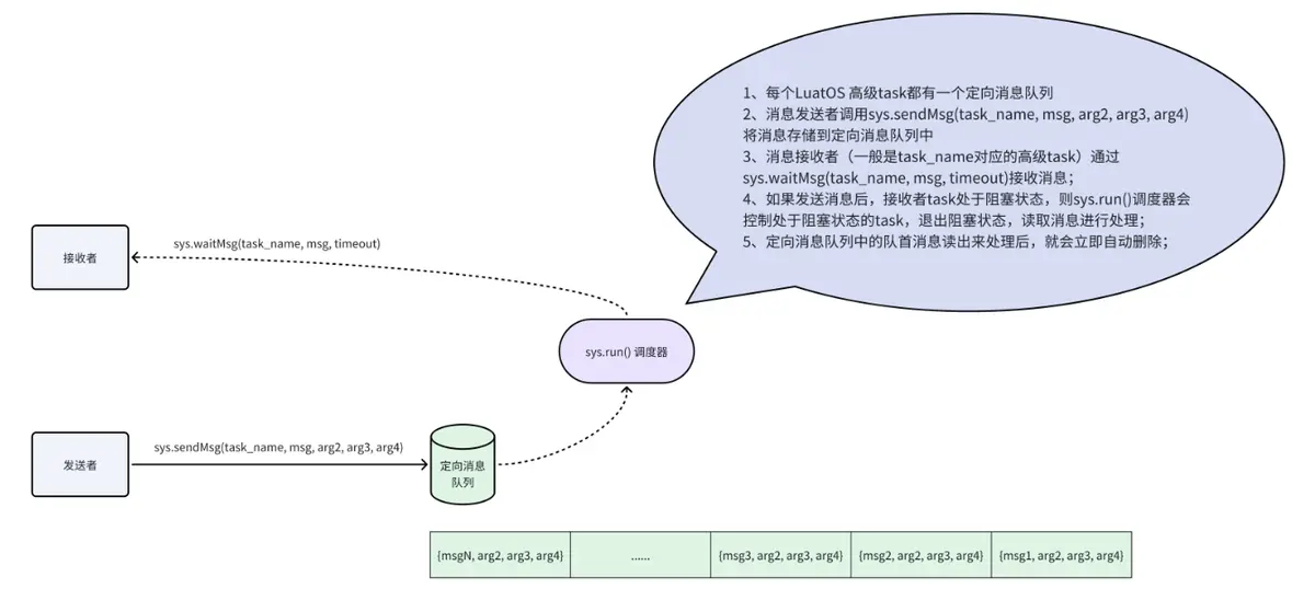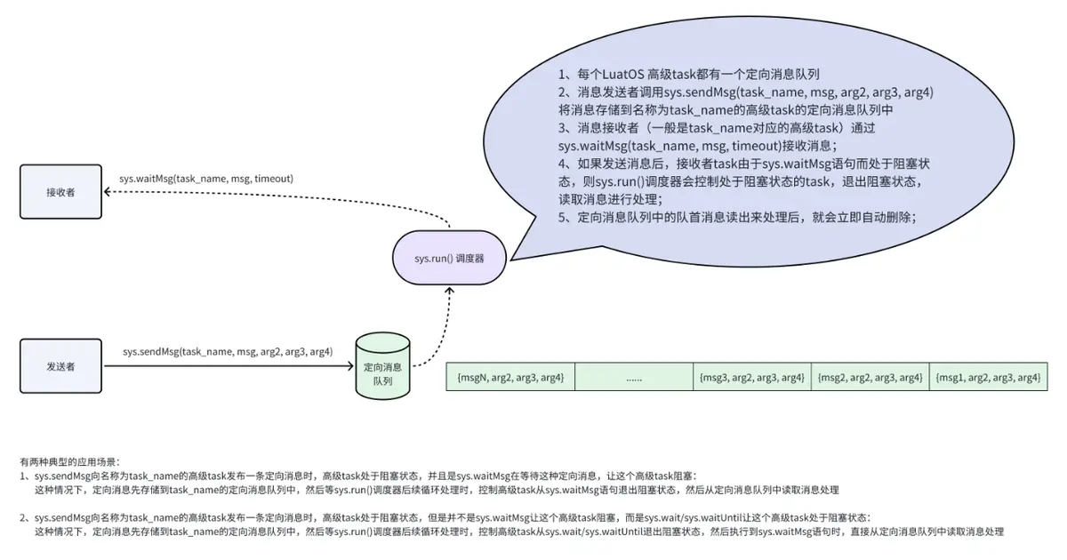 (3) 任意代码处执行 sys.sendMsg(task_name, msg, arg2, arg3, arg4),向名称为 task_name 的高级 task 发送了定向 msg 消息,在等待这个定向 msg 消息的并且处于阻塞状态的 task 可以接收到此消息,并且从阻塞状态切换为运行状态继续运行