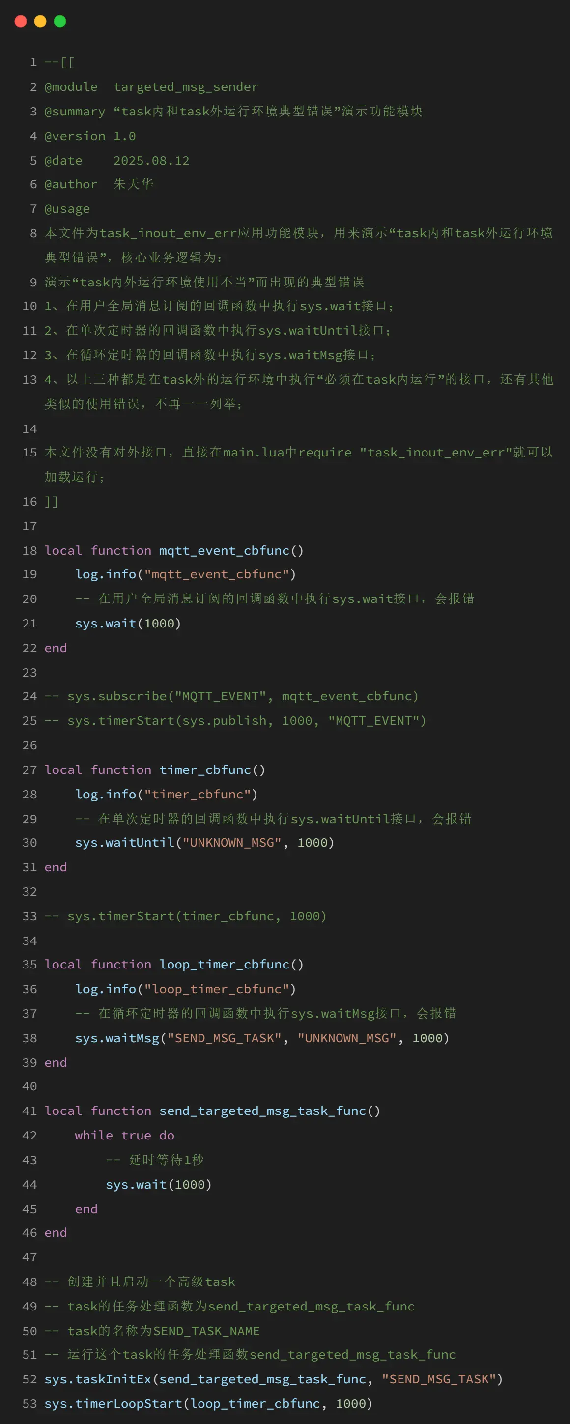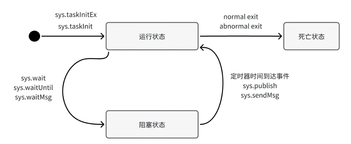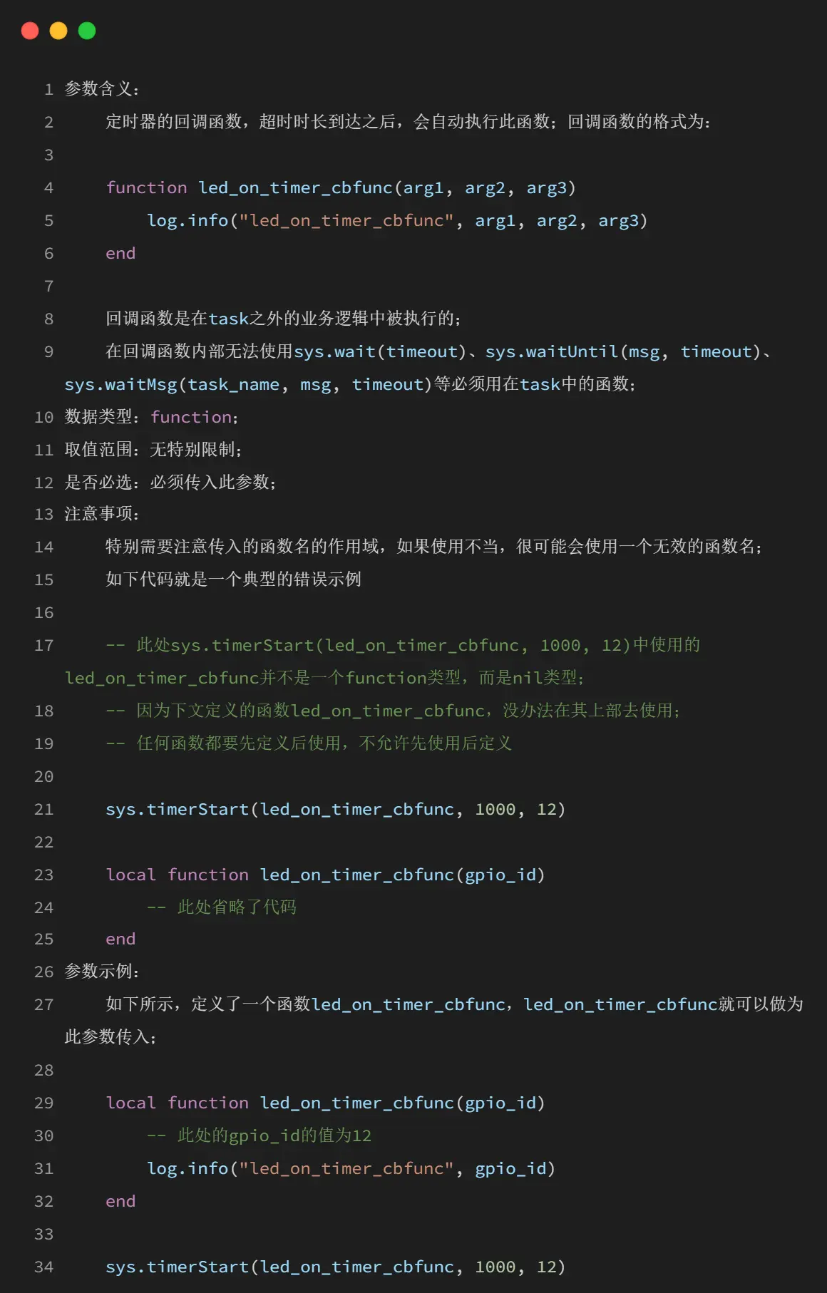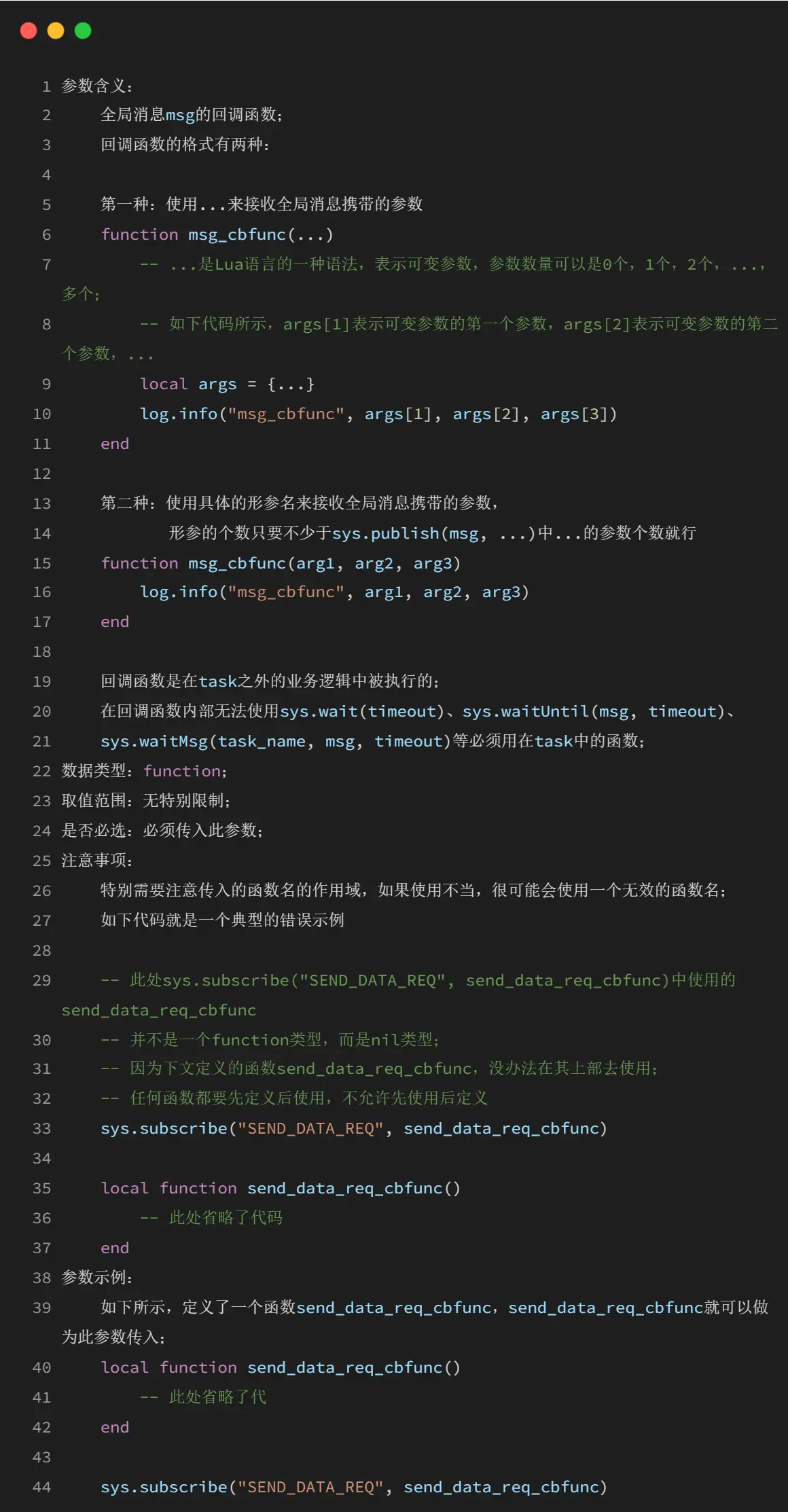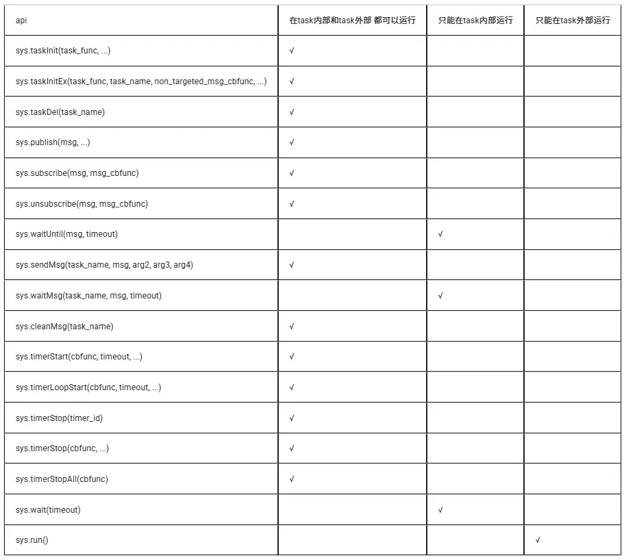sys.subscribe(msg,msg_cbfunc ),sys.timerStart(cbfunc , timeout, ...),sys.timerLoopStart(cbfunc , timeout, ...)中的回调函数,提供的是 task 外部运行环境;所以这些回调函数内部不能调用"只能在 task 内部运行"的 api,例如在 sys.subscribe(msg,msg_cbfunc )的msg_cbfunc内部不能调用 sys.waitUntil,sys.waitMsg,sys.wait;