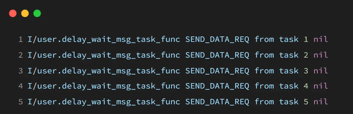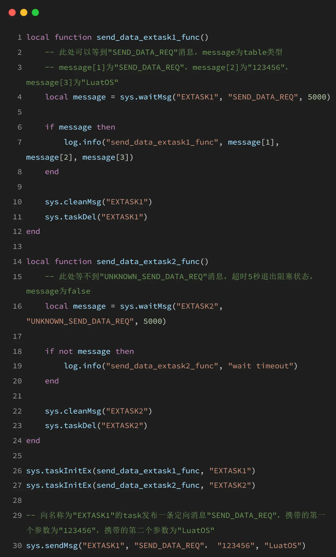 (3) 任务处理函数中执行到 sys.waitMsg(task_name, msg, timeout),表示在这里阻塞等待定向发给 task_name 的 msg 消息,或者阻塞等待 timeout 毫秒的时间;