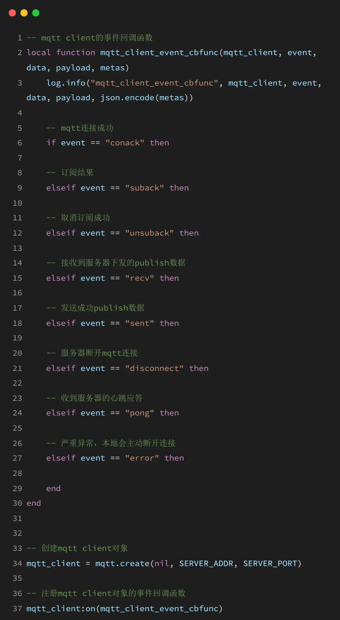 现在,LuatOS 框架的使用,基本上讲完了,接下来,我们来实际看一个完整 mqtt demo 项目代码,重点分析下这份 demo 项目代码中,使用到的本章节讲解的知识点;