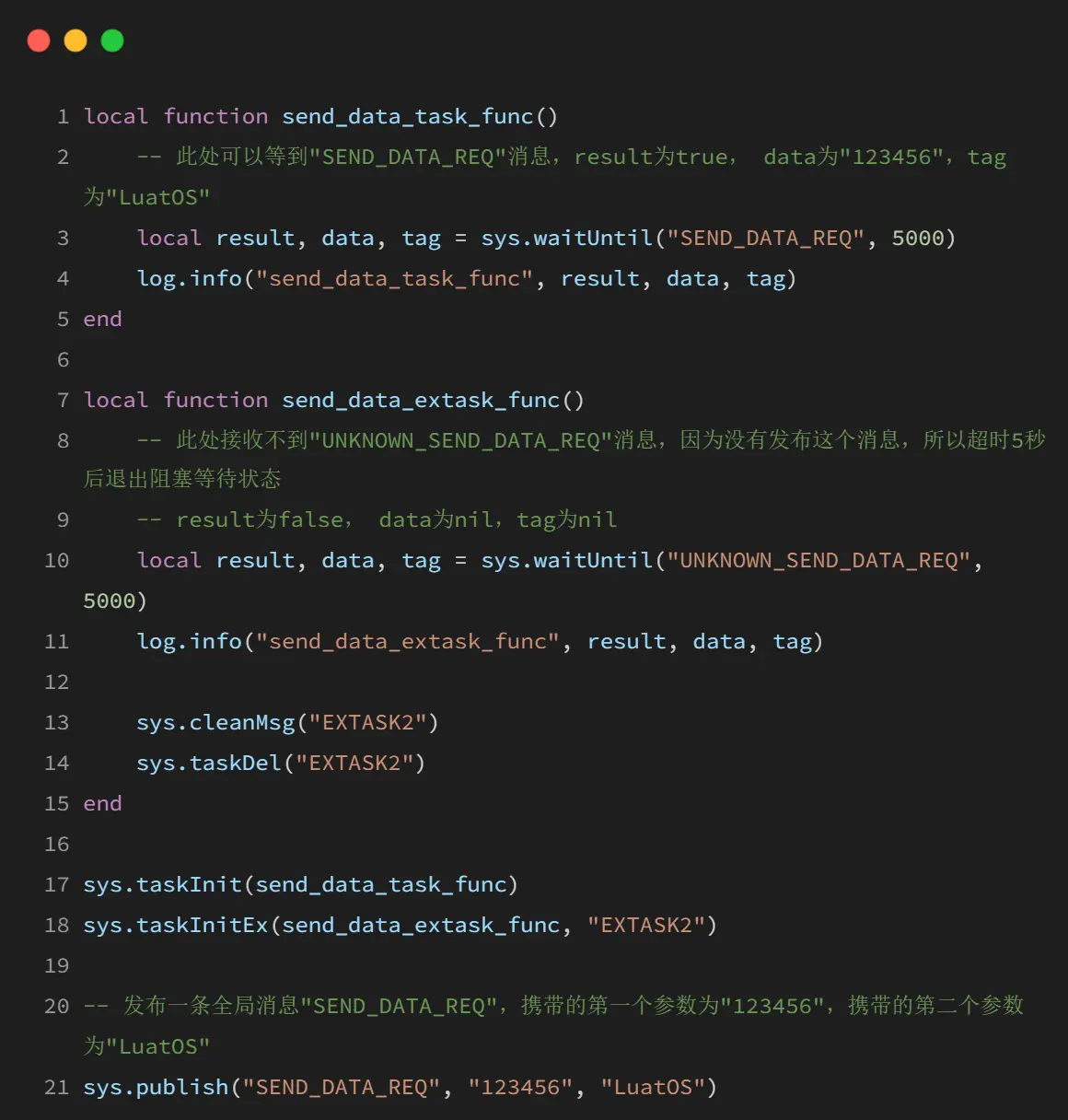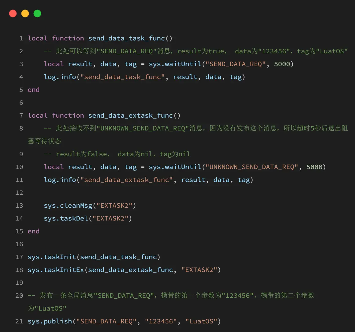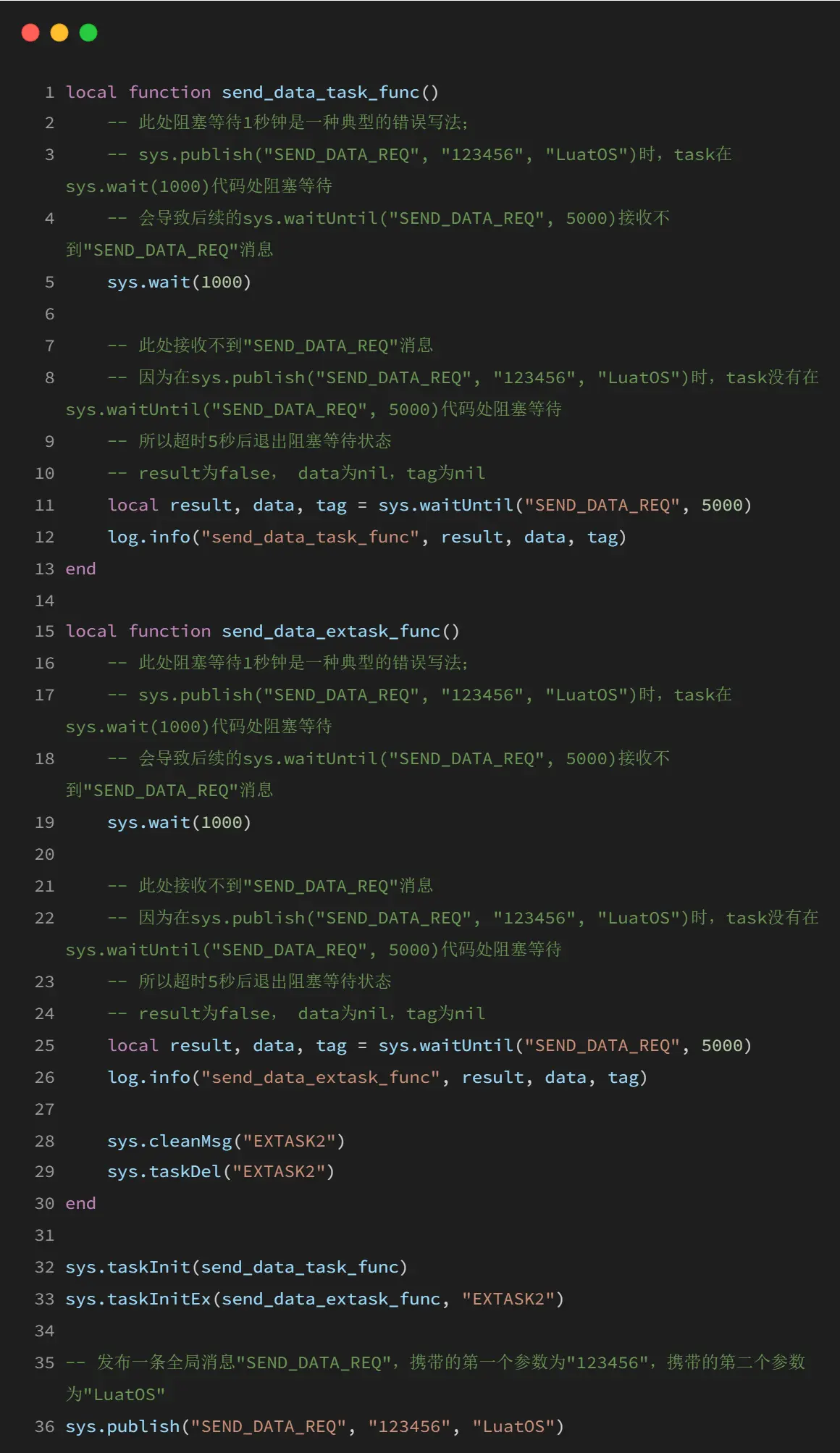 (2) 任务处理函数中执行到 sys.waitUntil(msg, timeout),表示在这里阻塞等待全局的 msg 消息,或者阻塞等待 timeout 毫秒的时间;