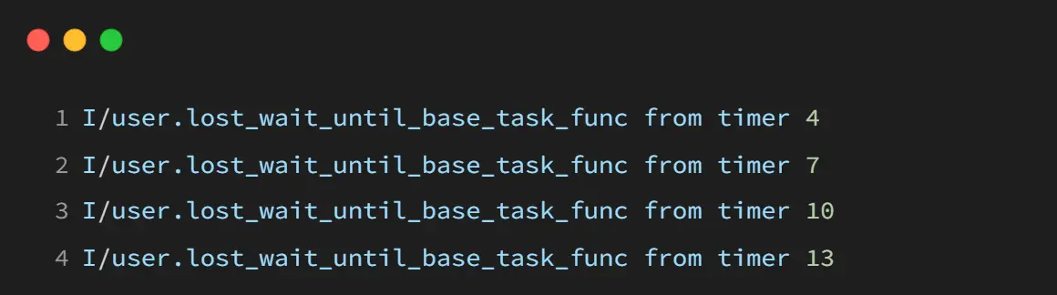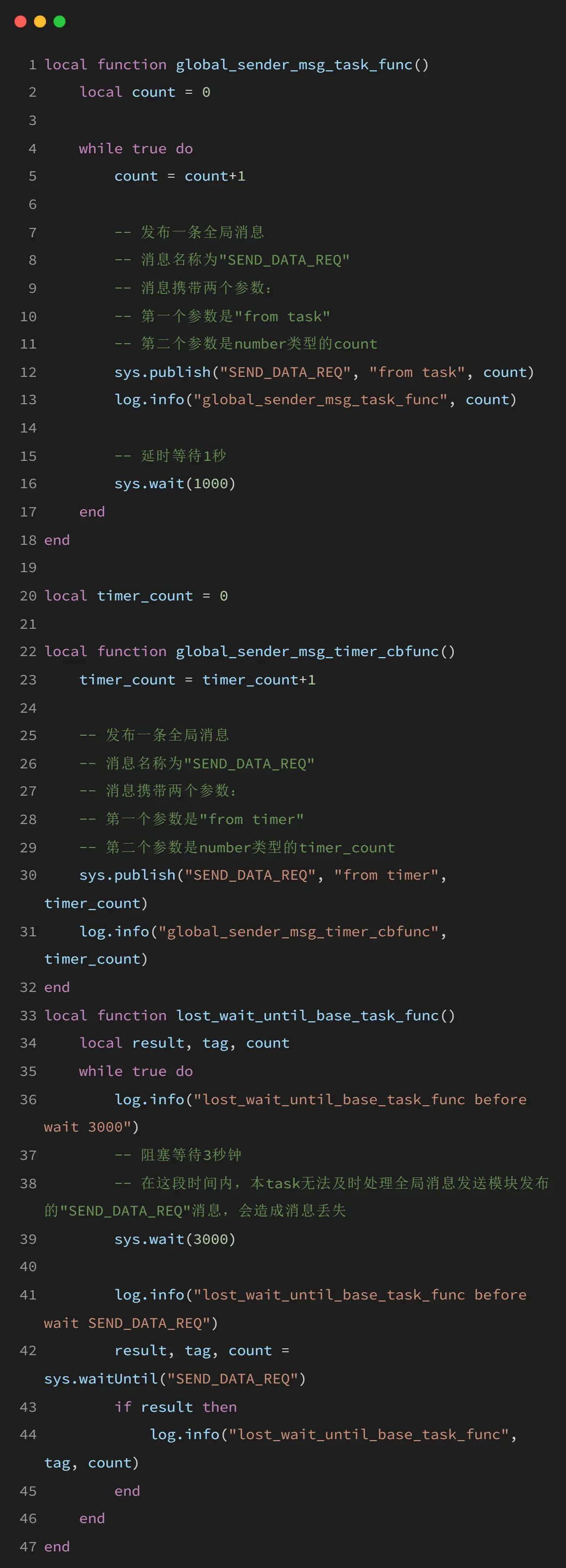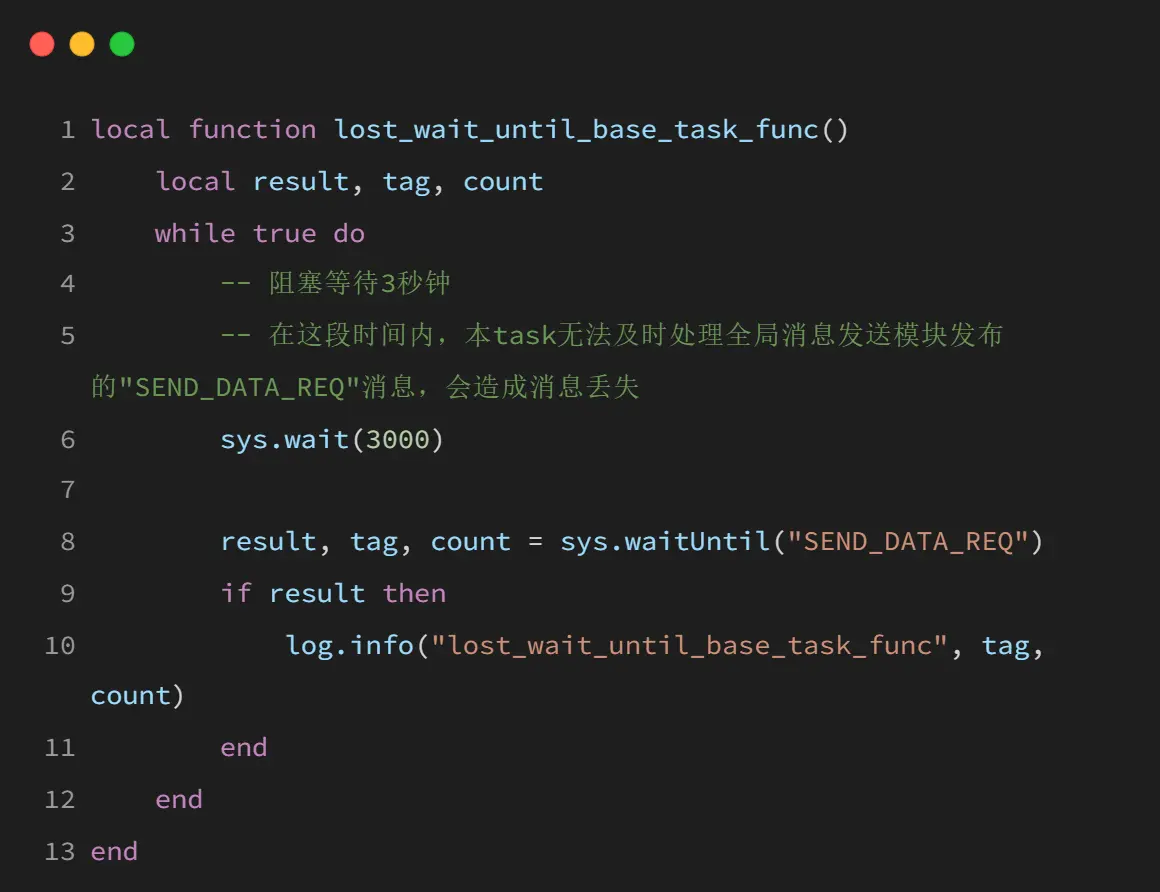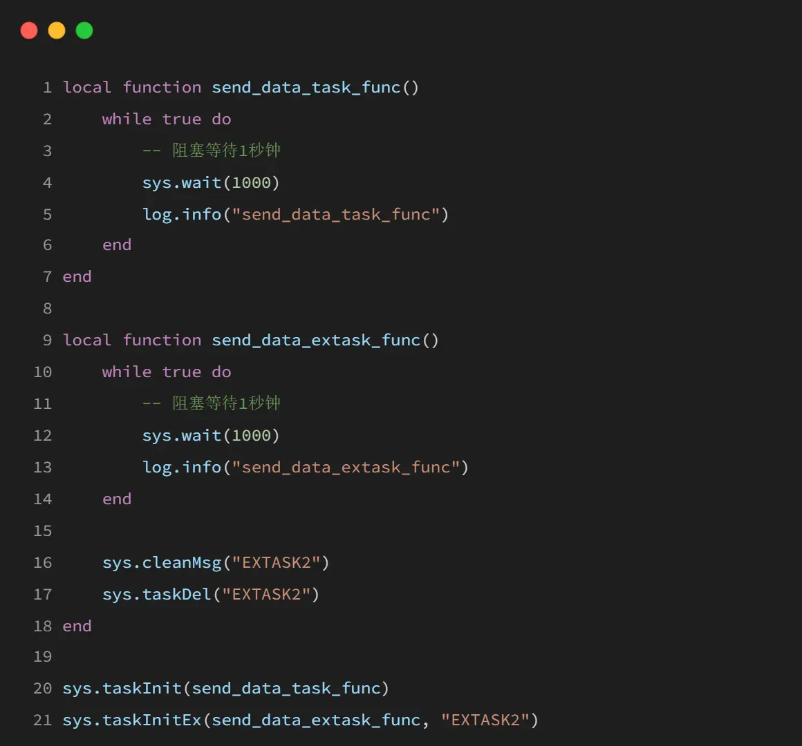 (2) 任务处理函数中执行到 sys.waitUntil(msg, timeout),表示在这里阻塞等待全局的 msg 消息,或者阻塞等待 timeout 毫秒的时间;