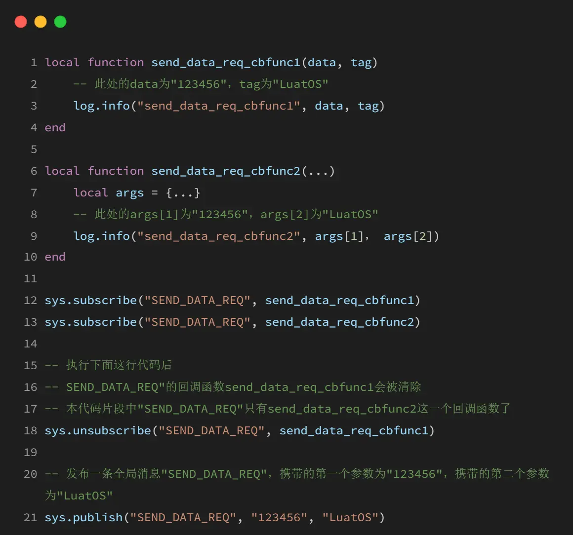 回调函数类型的订阅者,在消息调度处理过程中,不会自动删除;只有脚本程序中主动调用sys.unsubscribe(msg, cbfunc),才会删除