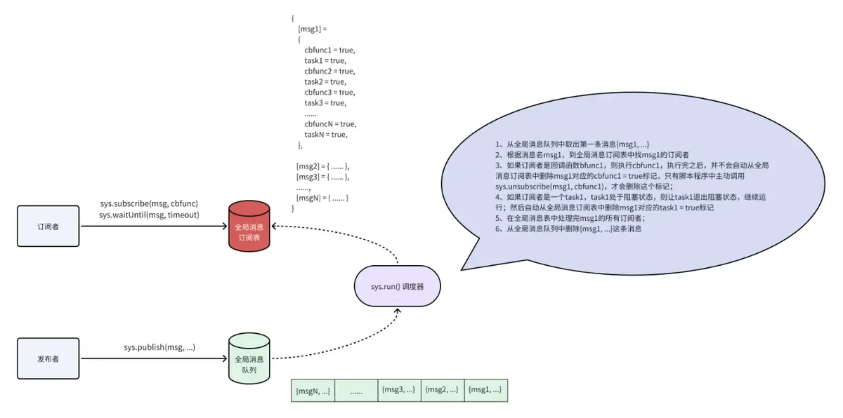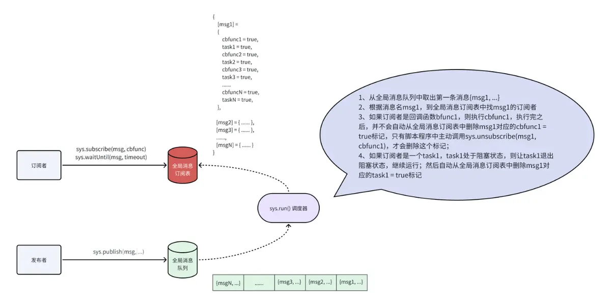 sys.subscribe(msg, cbfunc):为全局消息msg订阅一个回调函数cbfunc;相当于在全局消息订阅表中增加一项[msg] = {cbfunc = true}