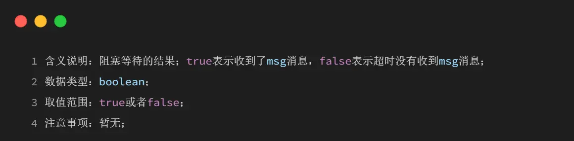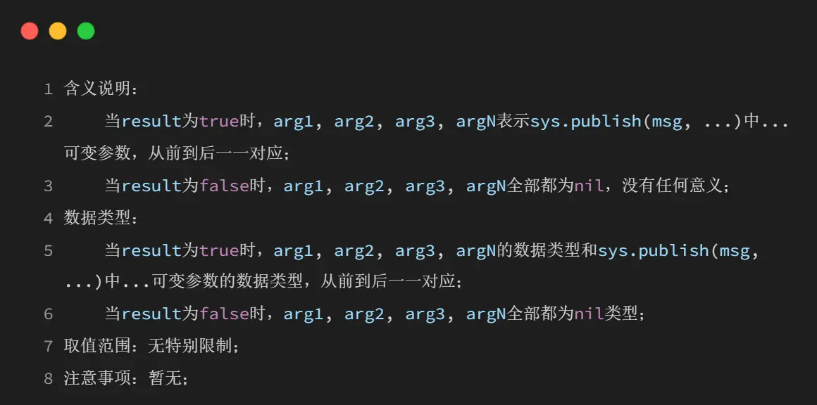 剩余的返回值 arg1, arg2, arg3, argN,表示可变数量的返回值,只有当第一个返回值 result 为 true 时,这些可变数量的返回值才有意义,和 sys.publish(msg, ...)中...表示的可变参数一一对应