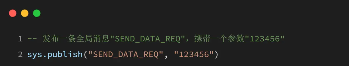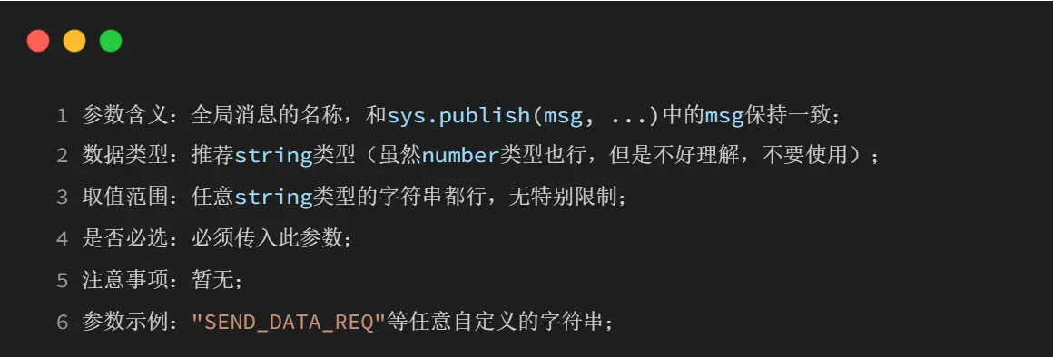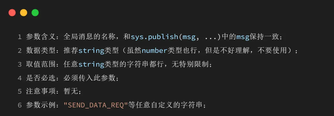 sys.publish(msg, ...):发布一条全局消息;相当于在全局消息队列中的队尾位置增加一项{msg, ...}