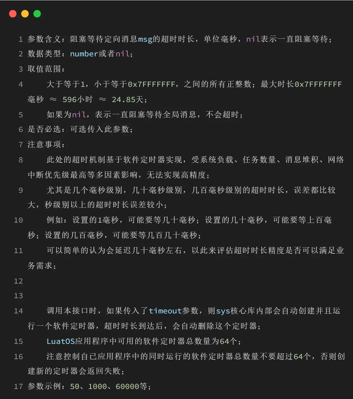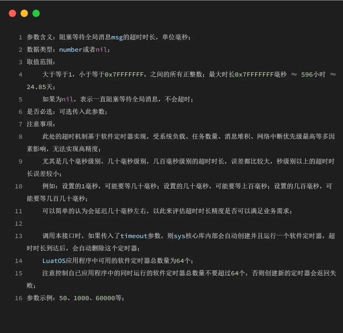 但是由于这部分内容和内核固件的耦合比较大,一般来说都是LuatOS的扩展库去使用,目前只有在socket功能有关的扩展库中使用过系统定向消息,用户编写的Lua应用脚本程序中很少用到,所以在这里也不细讲了;