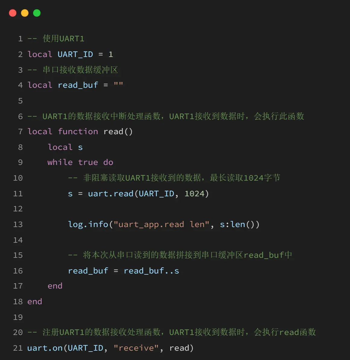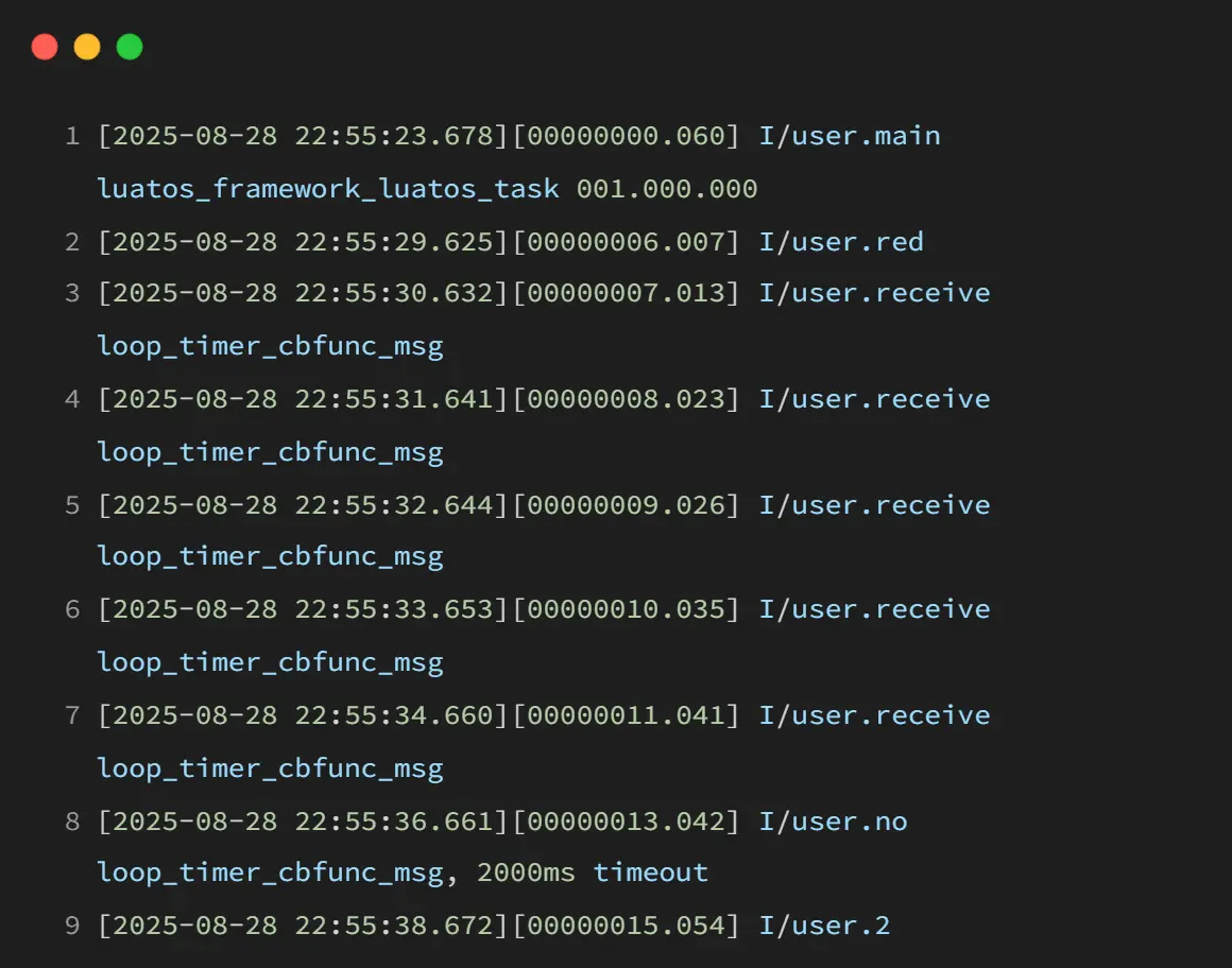 除了上面列举的这两种非定时器消息的uart,mqtt内核消息处理之外,LuatOS应用脚本开发中,还会用到很多种类似的内核消息处理逻辑,例如socket异步消息处理,http异步消息处理等等,这些内核消息的处理逻辑都是完全一样,只要注册一个回调处理数据即可,后续我们讲解具体的功能模块时,会详细讲解;