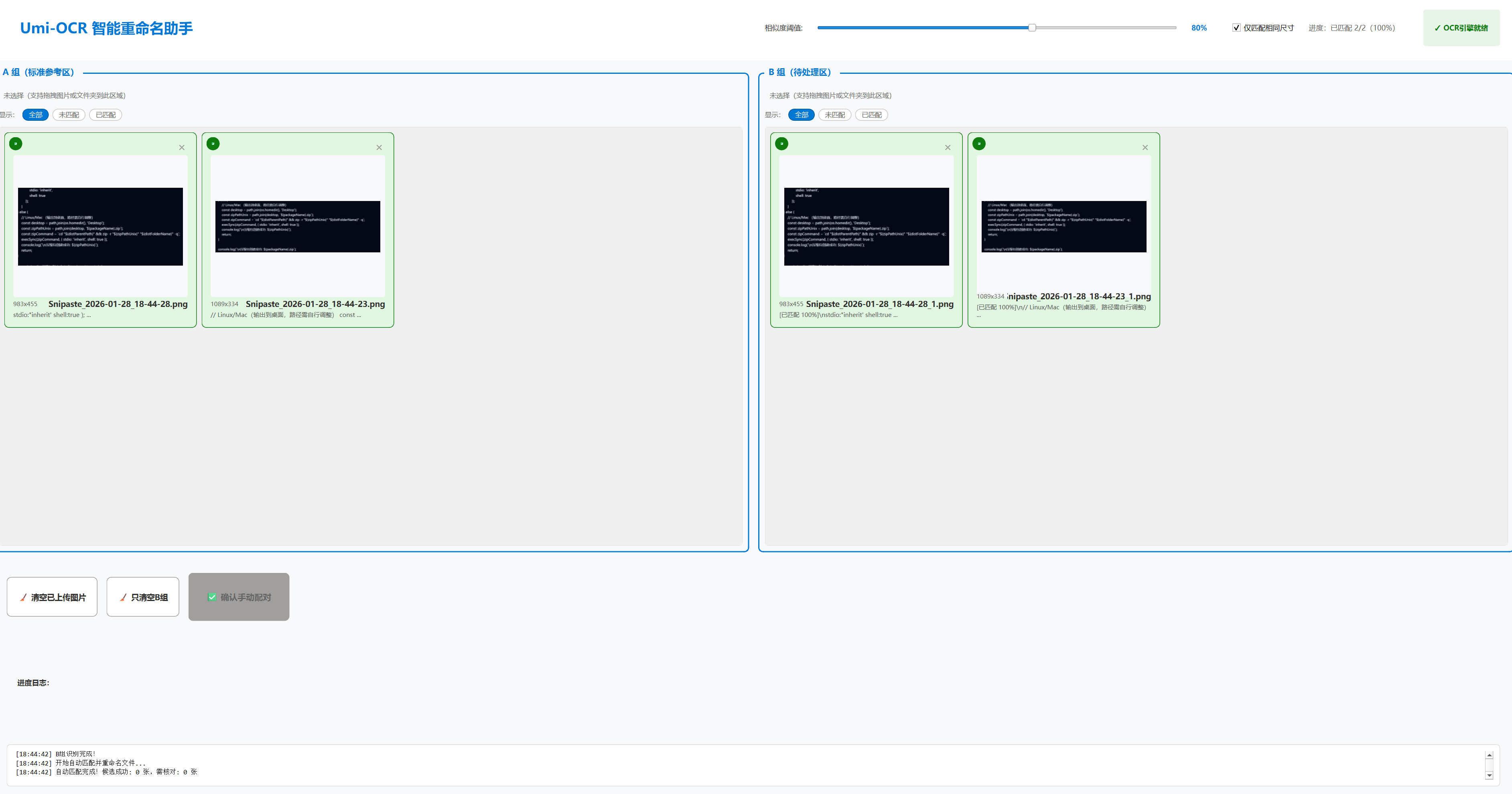 - 程序通过 OCR 分别识别 A、B 两组图片中的文字内容,计算文本相似度,将 B 组图片重命名为与最相似的 A 组图片名称。