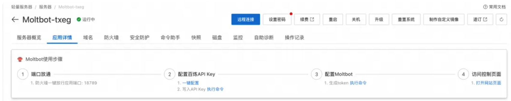 购买后大模型后,前往轻量应用服务器控制台,找到安装好Moltbot的实例,进入 「应用详情」 放行18789端口、配置百炼API Key、执行命令,生成访问Moltbot的Token