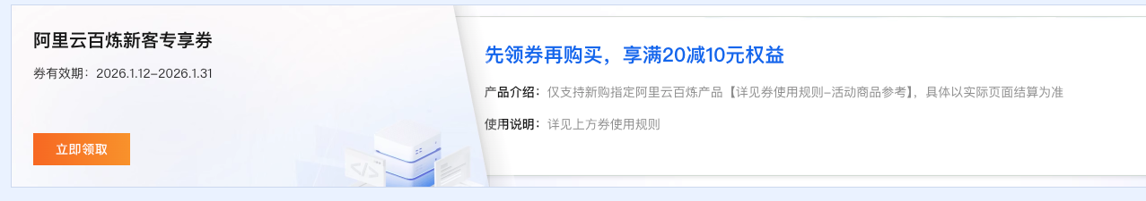 阿里云百炼目前正在推新客首购(满20减10元 新客首购) 活动,力度非常大。截止时间: 2026年1月31日(也就是这月底,剩最后3天了!)