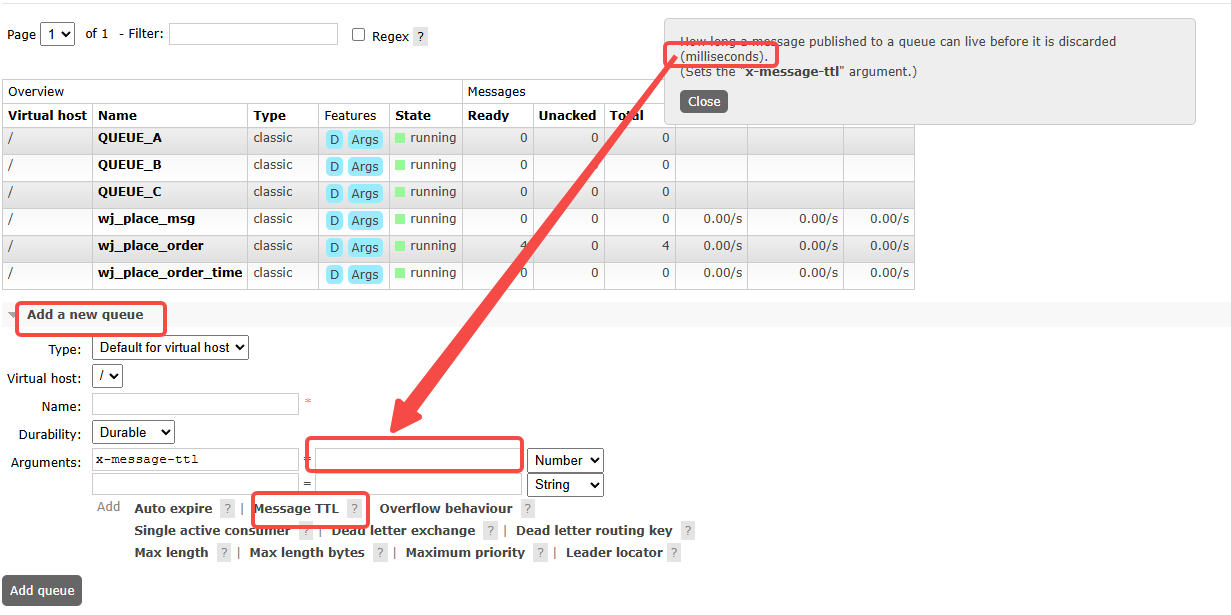 - 消息过期(TTL时间到): 队列设置:x-message-ttl=10000(10秒)