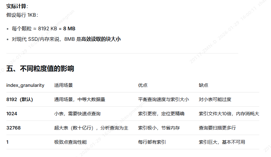 - index_granularity = 8192 表示:每个索引颗粒包含 8192 行数据