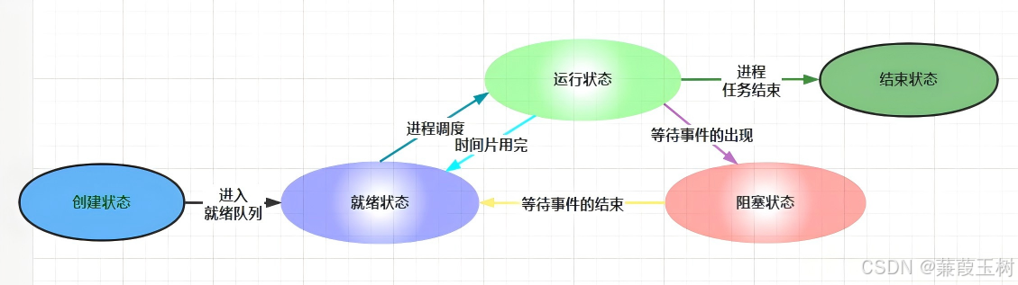 阻塞(Blocked):进程等待事件(如I/O完成),主动让出CPU。事件发生后转为就绪。