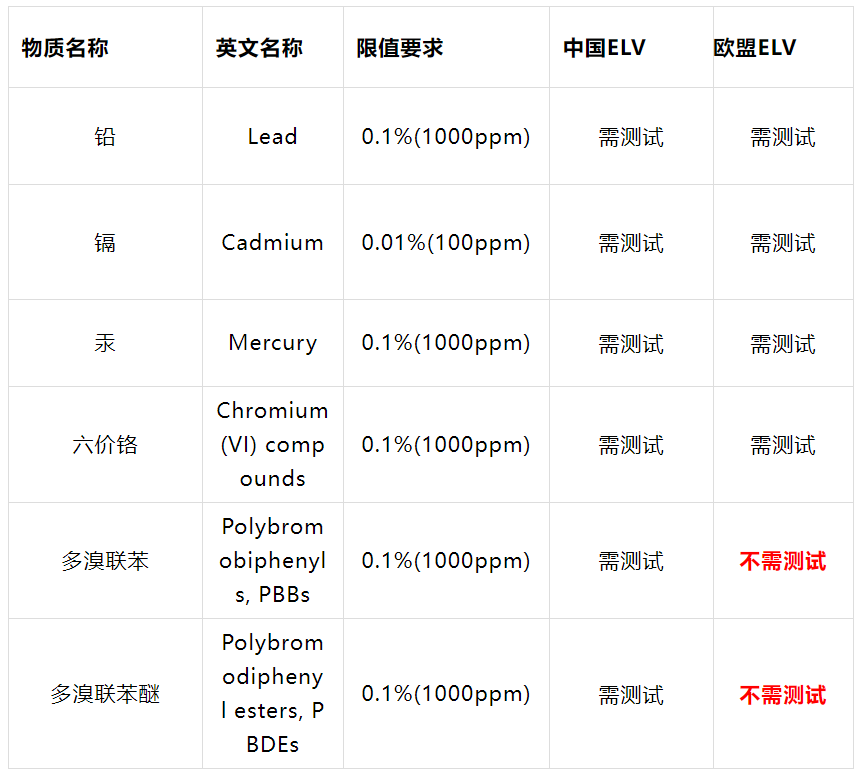 在测试项目上,欧盟ELV主要测试四项物质(Hg、Cd、Pb、Cr(VI)),而中国ELV测试六项物质(Hg、Cd、Pb、Cr(VI)、PBB、PBDE),RoHS则测试十项物质(Hg、Cd、Pb、Cr(VI)、PBB、PBDE、DEHP、DBP、BBP、DIBP)。