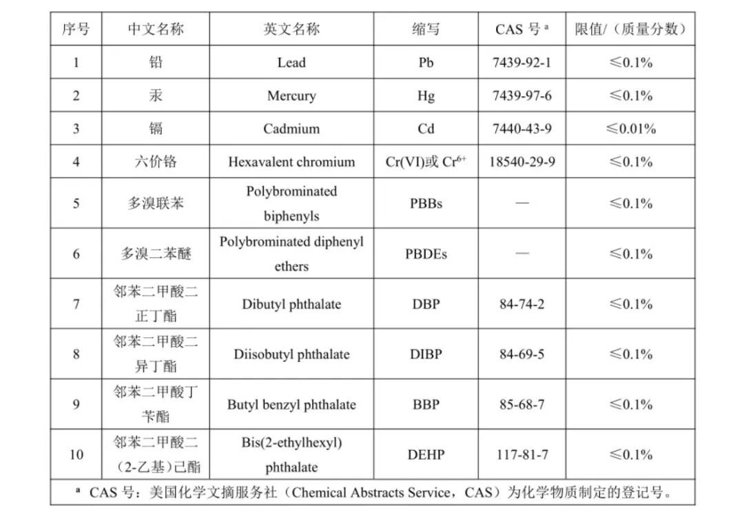 RoHS指令对十种主要有害物质设定了严格的限值要求,这些物质包括铅(Lead)、镉(Cadmium)、汞(Mercury)、六价铬化合物(Chromium(VI) compounds)、多溴联苯(Polybromobiphenyls, PBBs)、多溴联苯醚(Polybromodiphenyl ethers, PBDEs)、邻苯二甲酸二(2 - 乙基己基) 酯(DEHP)、邻苯二甲酸甲苯二异丁酯(BBP)、邻苯二甲酸二丁酯(DBP)和邻苯二甲酸二异壬酯(DINP)。这些物质在电子电气产品中的使用被限制在极低的百分比水平,以减少对环境和人体健康的影响。